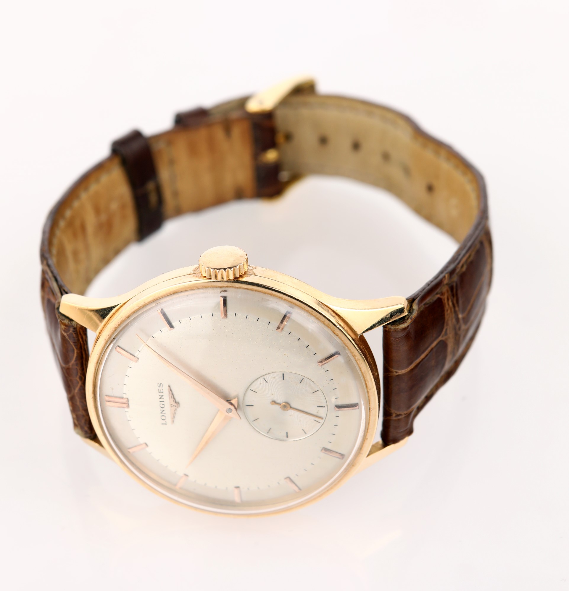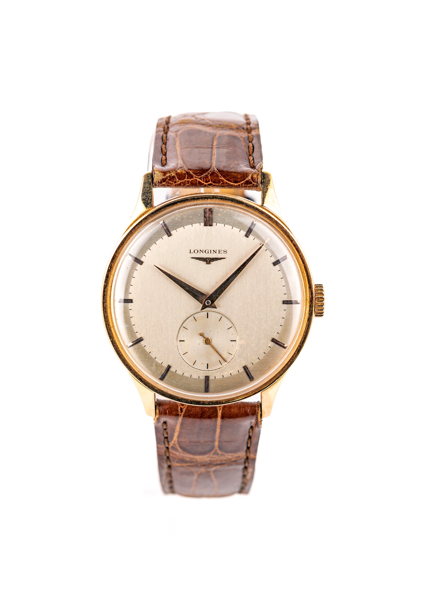 Longines da polso in oro Diametro cassa mm. 38 Oro rosa 750/000. Ref. 4915-18, fondello a scatto, quadrante argentato, indici applicati, secondi in basso, lancette dauphine. Movimento manuale n° 9774122, bilanciere monometalico con viti, spirale Breguet. Anni '50