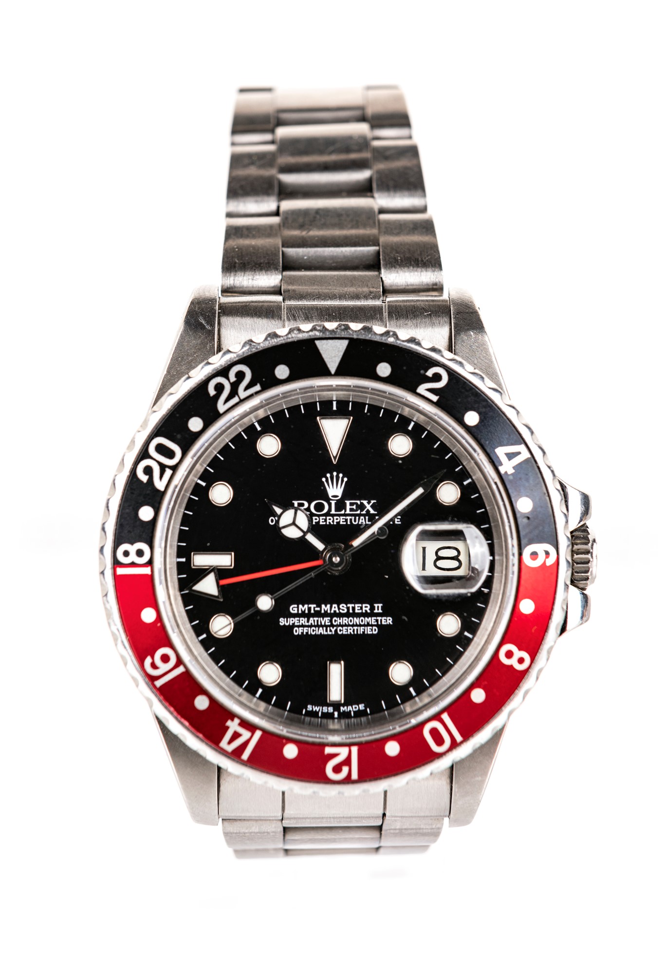 Rolex oyster GMT-Master II in acciaio Diametro mm. 40 Acciaio. Cassa n° 9623055, ghiera con inserto graduato nero e rosso, corona a vite protetta da spallette, fondello a vite. Bracciale oyster in acciaio n° 783660, finali 501, chiusura a deployante. Quadrante nero con indici a bicchierini, data, lancette luminescenti, secondi al centro, lancetta GMT a freccia. Movimento automatico cal 3085, bilanciere monometalico con viti microstella, spirale Breguet. Accessori: quadrante ed inserto originali cambiati all'epoca dalla Rolex. Anno 1986 circa