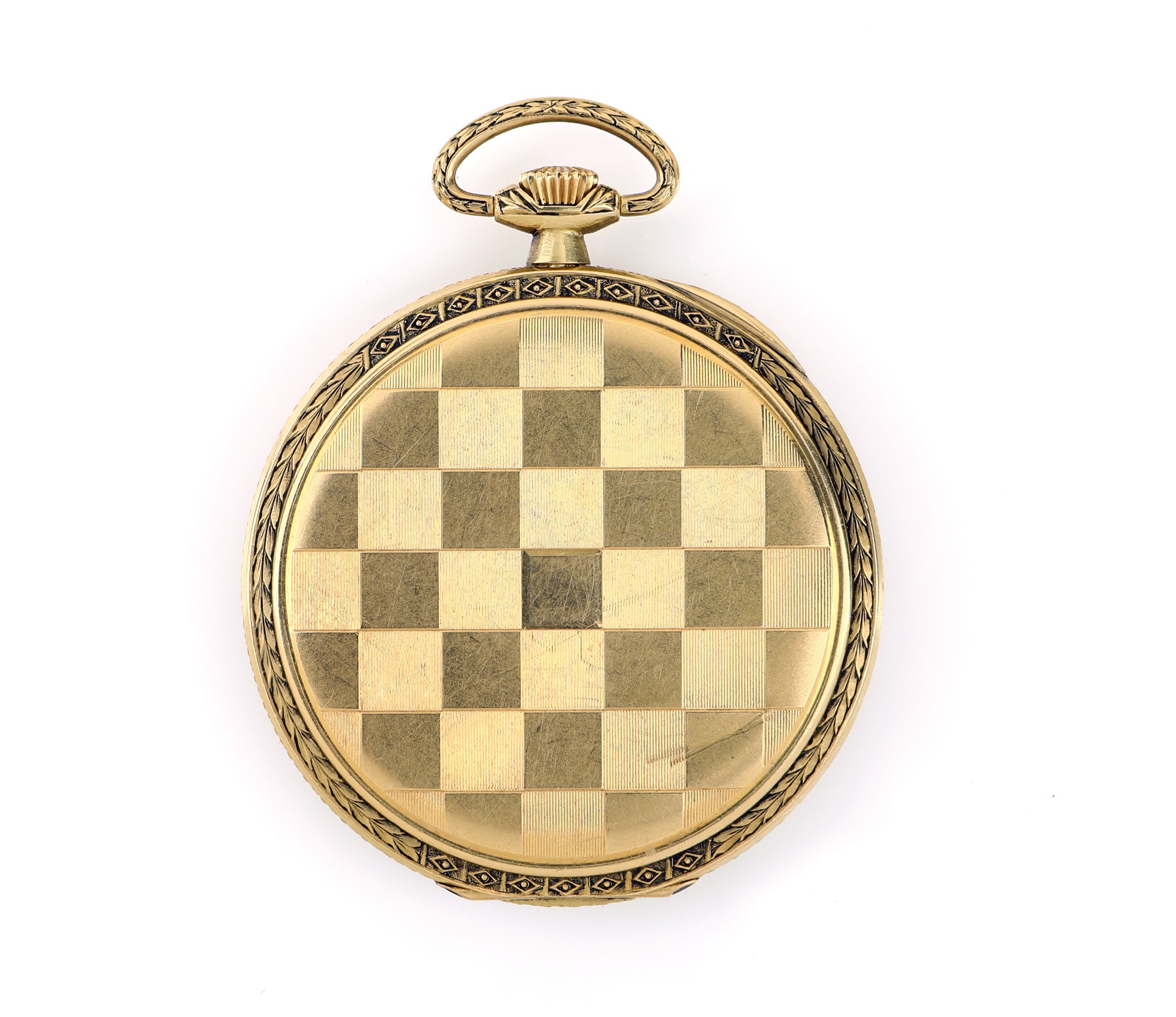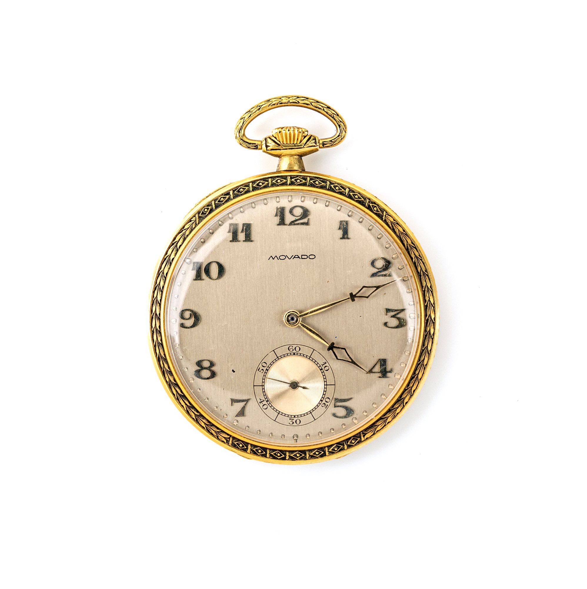Movado, orologio da tasca in oro Diametro mm 44 Oro giallo 750/000. Remontoir, cassa a 3 corpi n° 630887, fondello decorato con disegni geometrici. Quadrante argentato, numeri arabi, secondi in basso, lancette a cattedrale. Movimento con scappamento ad ancora, spirale Breguet. Da revisionare Cira anni '30