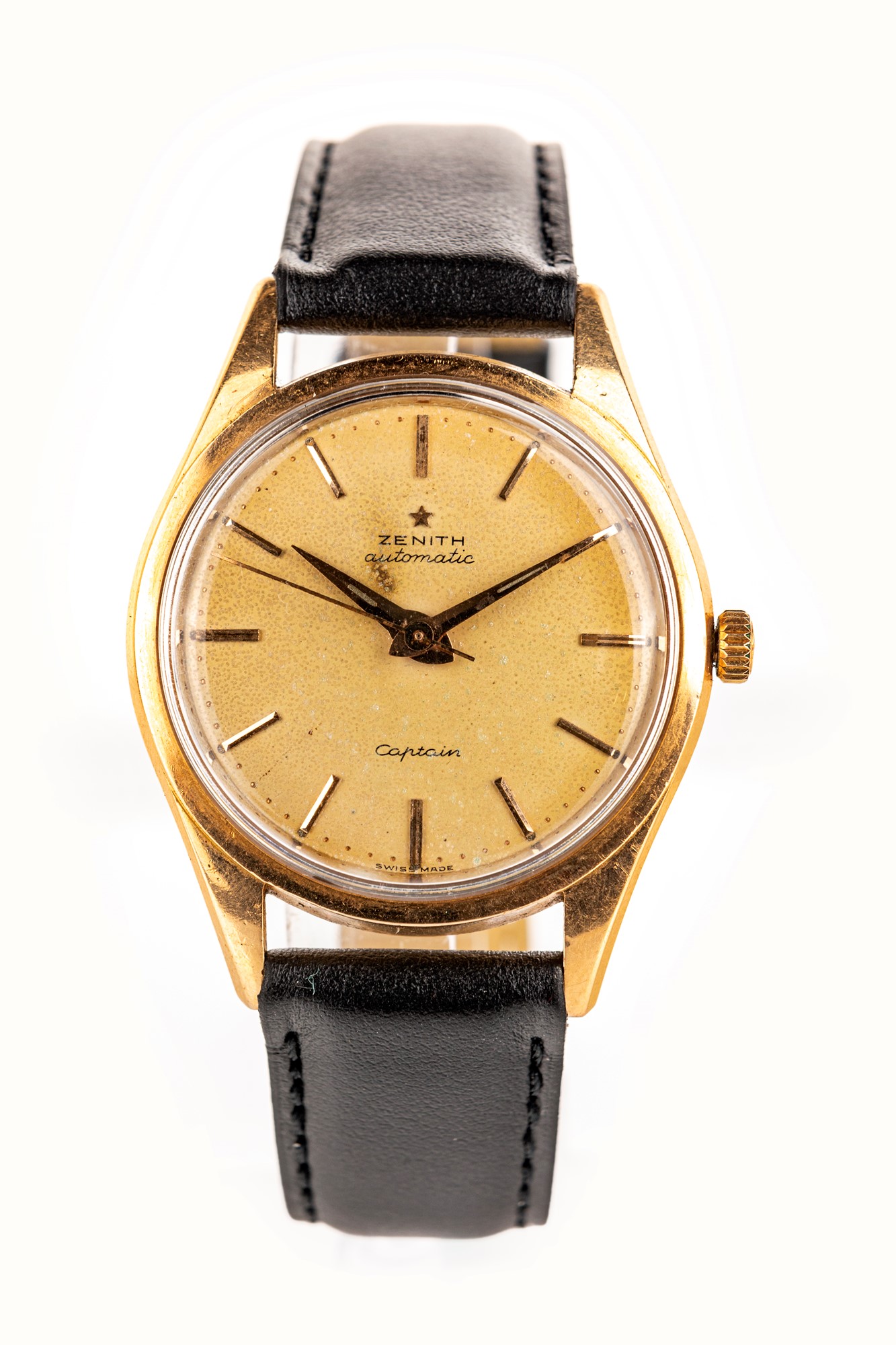 Zenith captain da polso automatico in oro Diametro mm 35 Oro giallo 750/000. Cassa n° 892855, fondello a vite. Quadrante dorato, indici a bastone applicati, secondi al centro. Movimento automatico, cal. 133.8, n° 5315535, bilanciere monometalico con viti, spirale piana. Anni '58