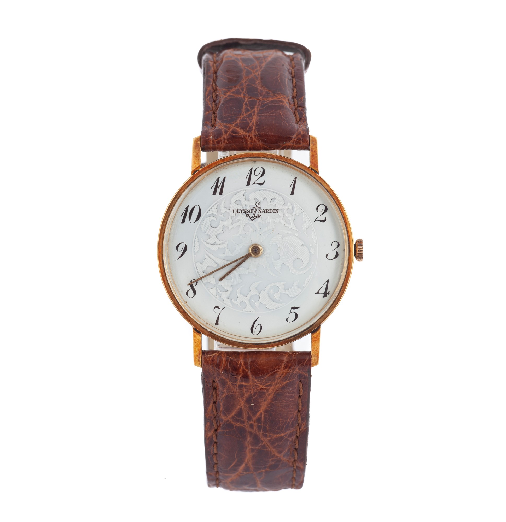 Ulisse Nardin in oro da polso Diametro cassa mm 32 Oro giallo 750/000. Fondello a scatto. Quadrante bianco con decorazione al centro, numeri arabi stampati, lancette a bastone. Movimento manuale calibro NO 10c, n° 018716, bilanciere monometalico, spirale piana. Anni '70