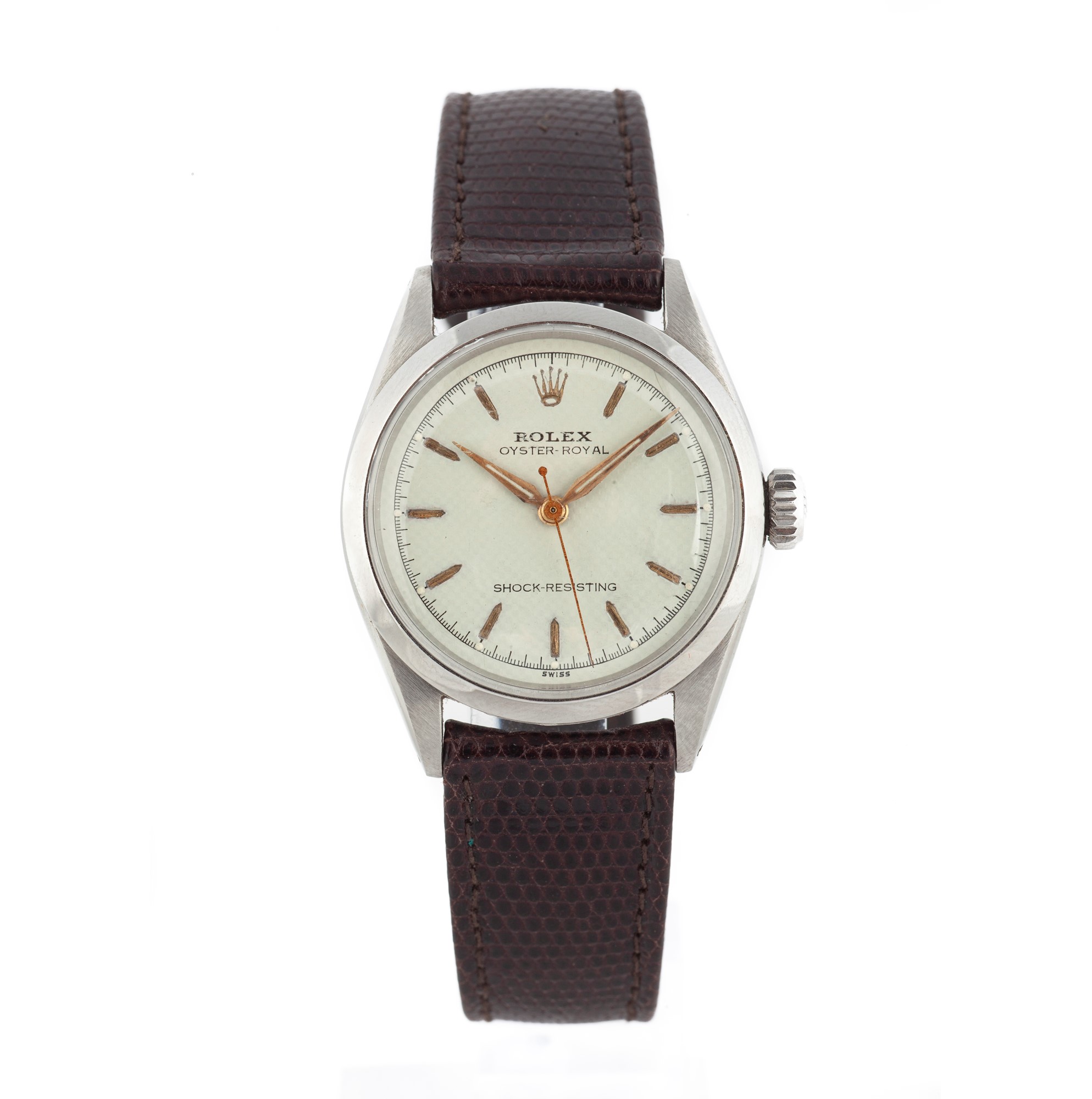 Rolex oyster royal in acciaio Diametro cassa mm 32. Acciaio. Ref. 6444, cassa n° 115331, corona a vite, fondello a vite, cinturino in pelle e fibbia in acciaio firmati, quadrante a nido d'ape, indici lancette alpha, secondi al centro. Movimento manuale cal 1210, n°11724, bilanciere monometalico con viti, spirale Breguet. Anni '50