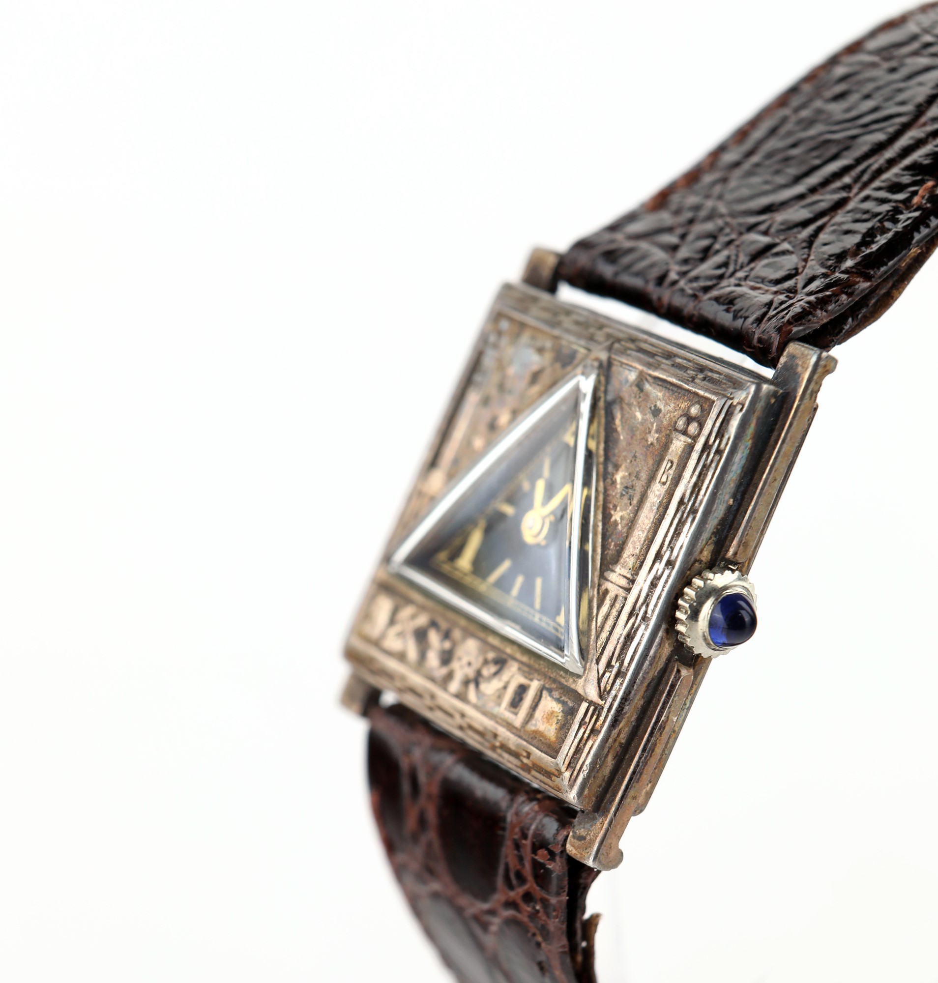 Orologio da polso massonico in argento Cassa mm. 31 x 27 Argento 800/000. Cassa decorata con motivi massonici, corona con cabochon, fondello a scatto. Quadrante triangolare nero, indice e lancette a bastone. Movimento manuale, cal. Peseux, bilanciere monometalico con viti, spirale piana. Anni '60