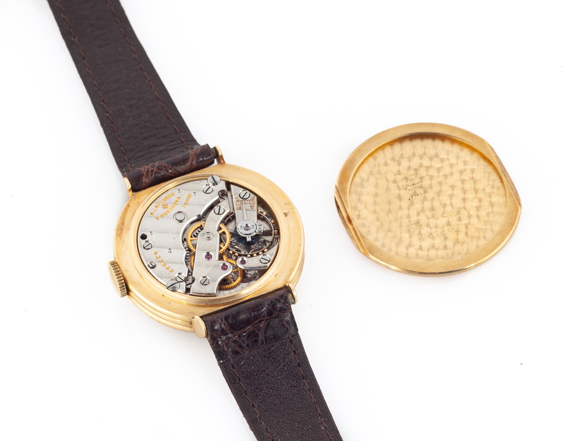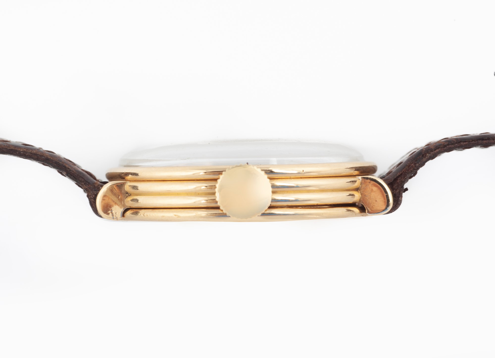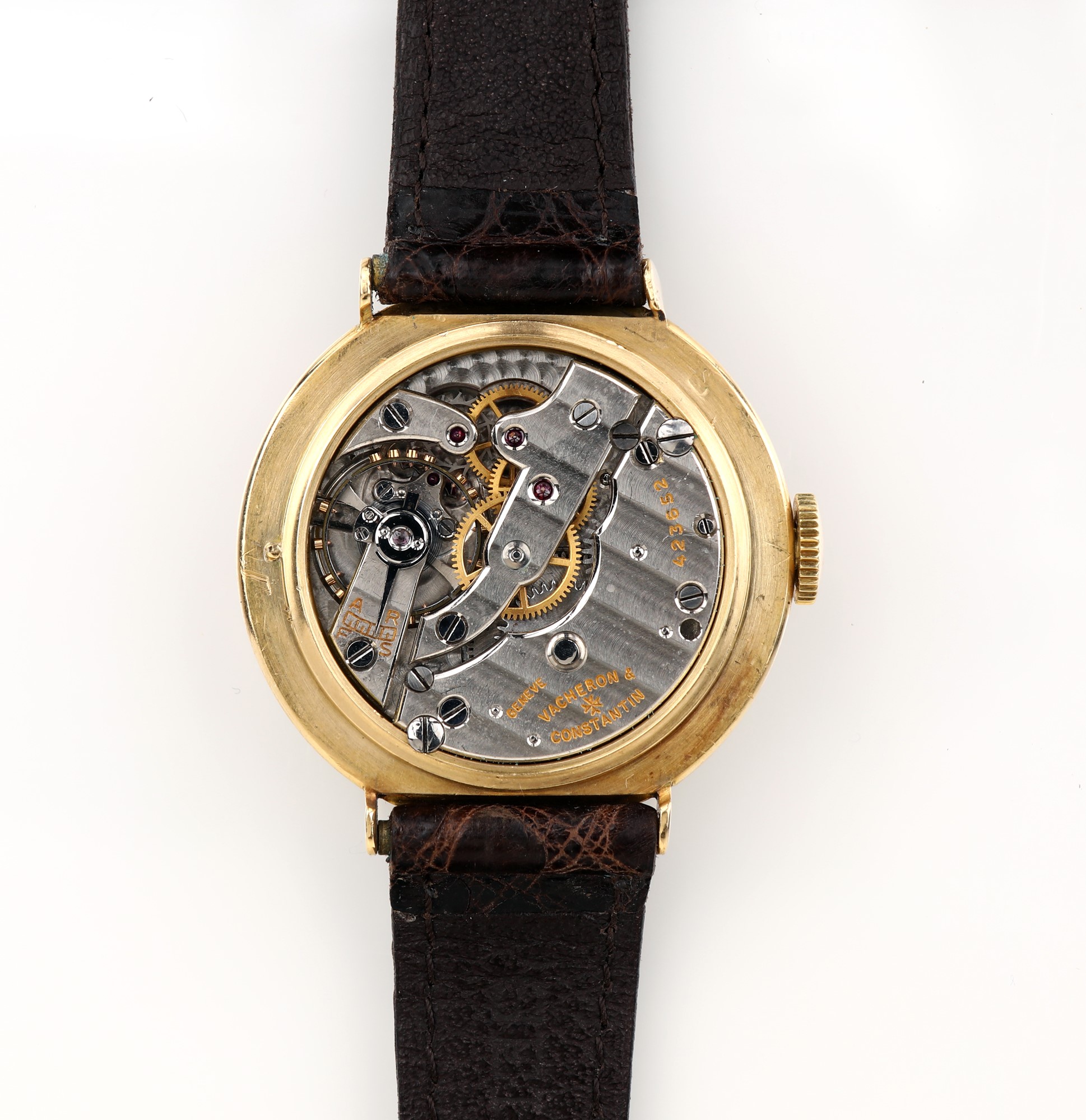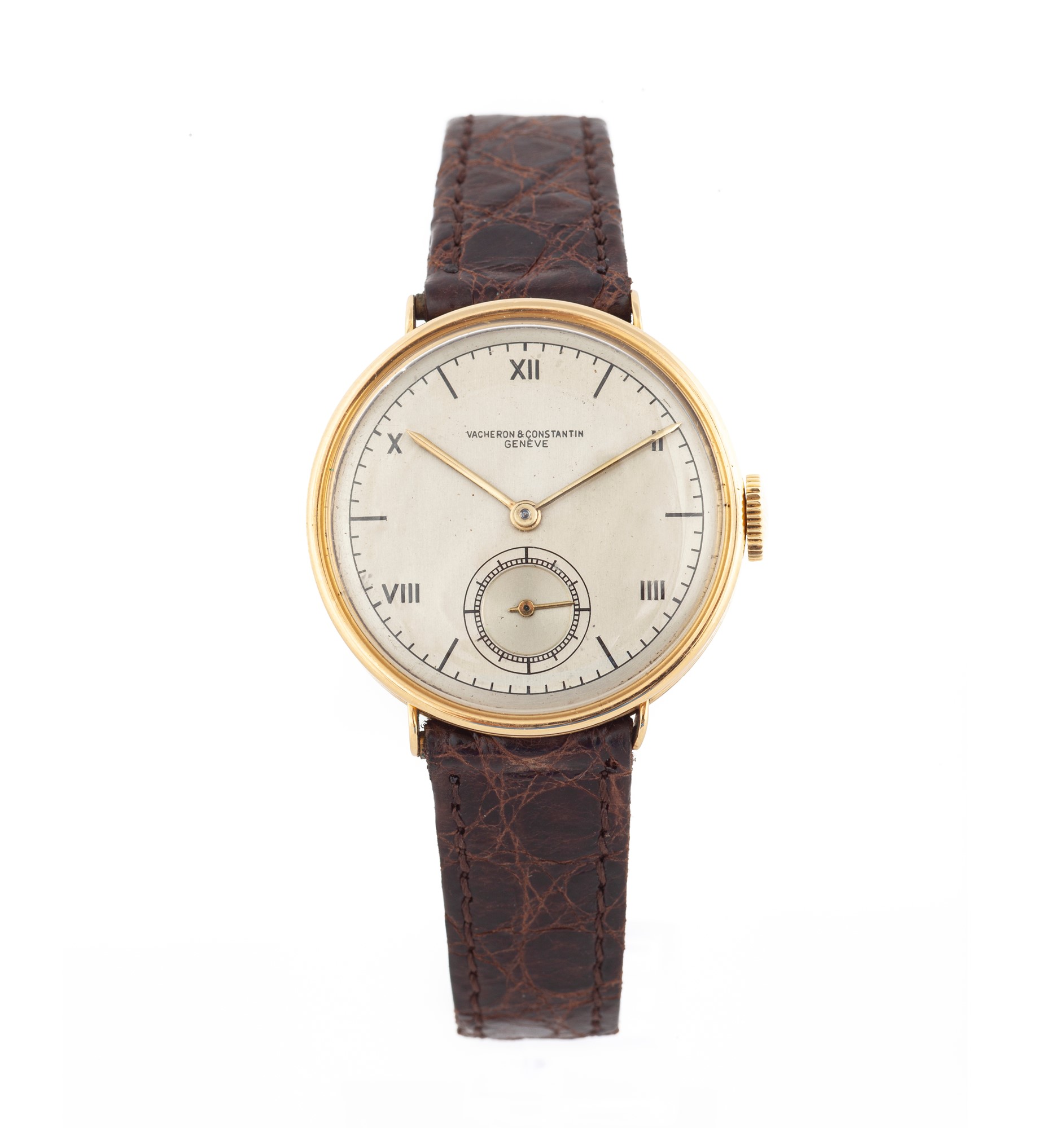 Vacheron & Constantin in oro Diametro mm. 31,5. Oro giallo 750/000. Cassa n° 267380 con carrure scanalata, fondello a scatto. Quadrante argentato, indici stampati, secondi in basso, lancette a bastone, movimento manuale n° 423652. BIlanciere bimetalico con viti, spirale Breguet. Anni '50 circa