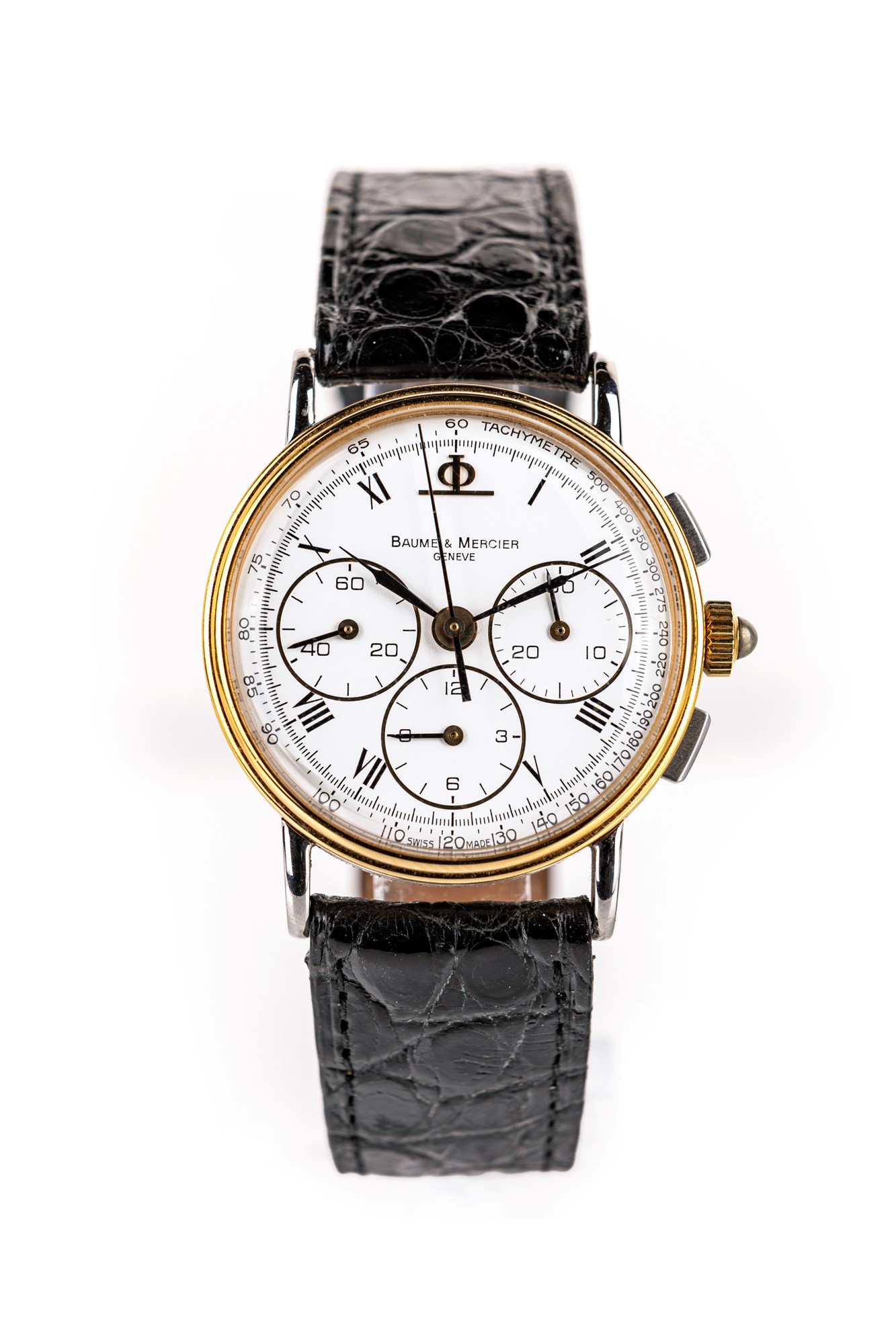 Baume & Mercier cronografo da polso in acciaio e oro Diametro mm. 31 Acciaio. Ref. n° 6101-099, cassa in acciaio e oro n° 2153103, pulsanti rettangolari, fondello a scatto. Cinturino e fibbia dorata originale. Quadrante bianco, numeri romani, quadrantini ausiliari dei secondi, dei minuti e delle ore, lancette index. Movimento manuale, cal. 1873 n° 4478451, ruota a colonne, bilanciere monometalico, spirale piana. Anni '80