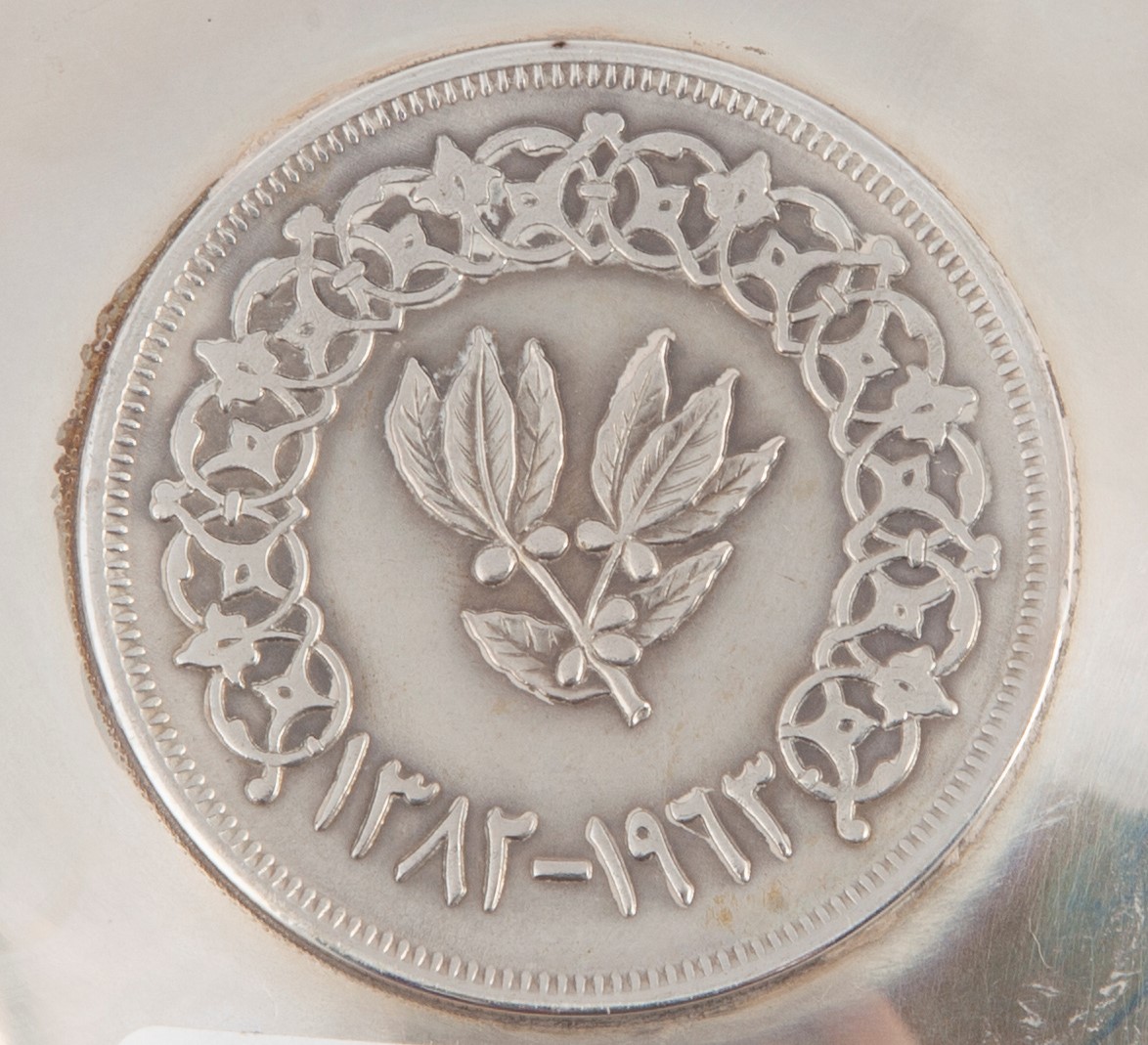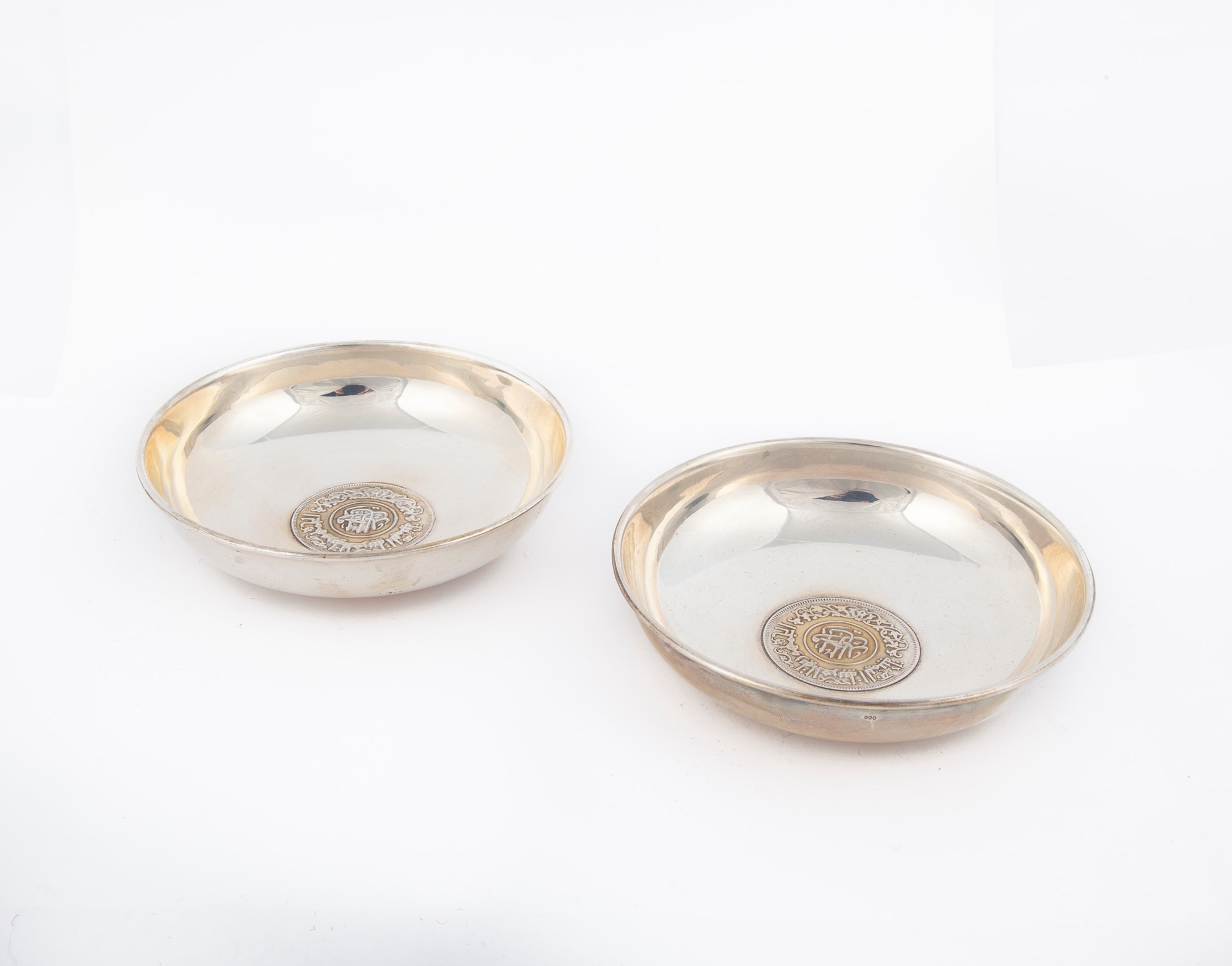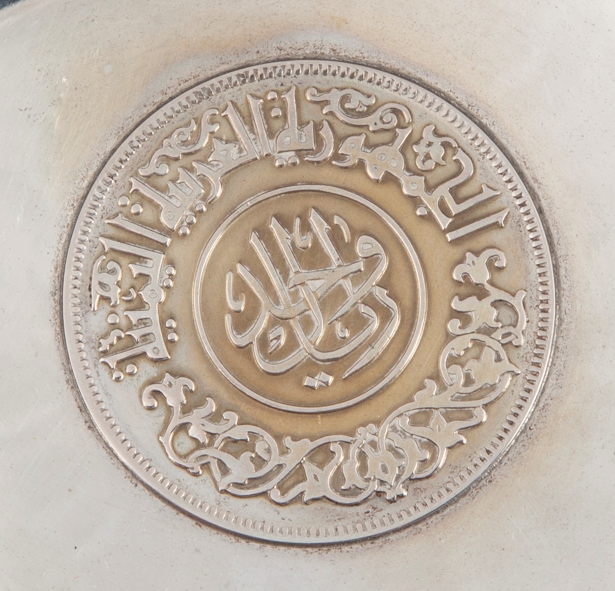 Coppia di ciotole in argento 800 caratterizzate sul fondo da moneta islamica cm 2,8x11,5 - gr. 170