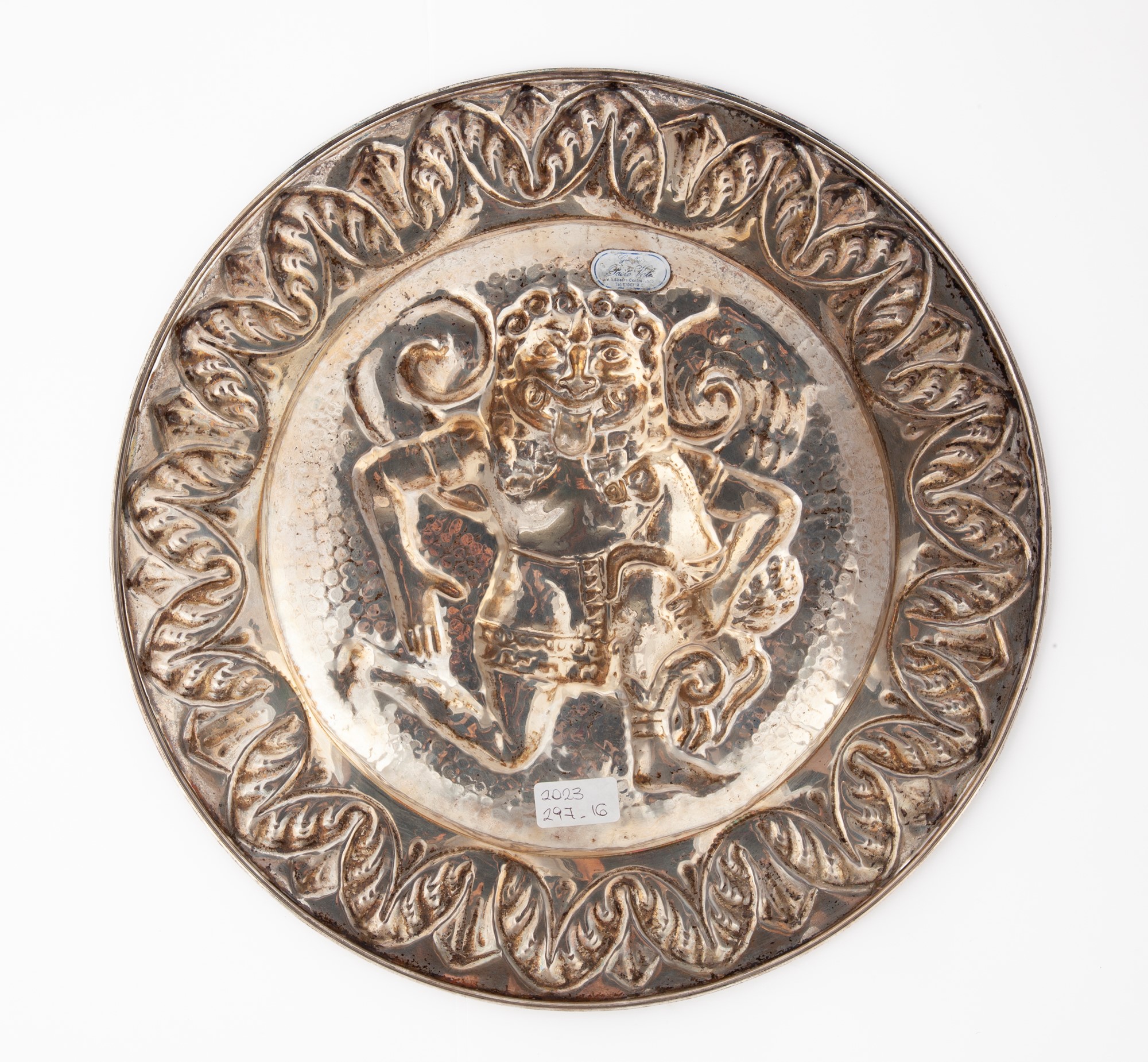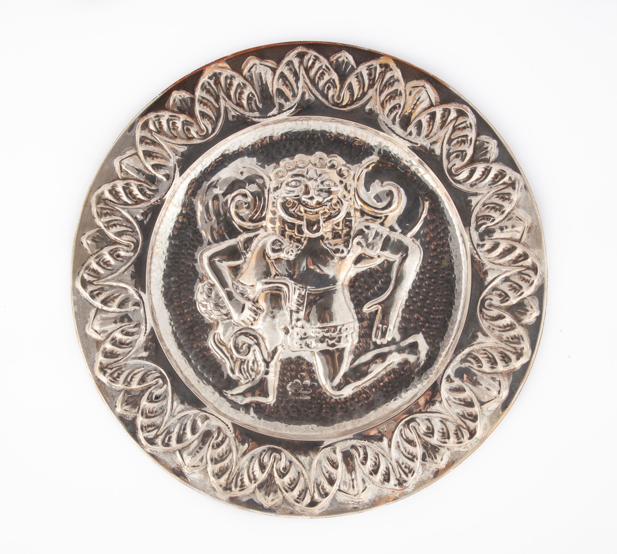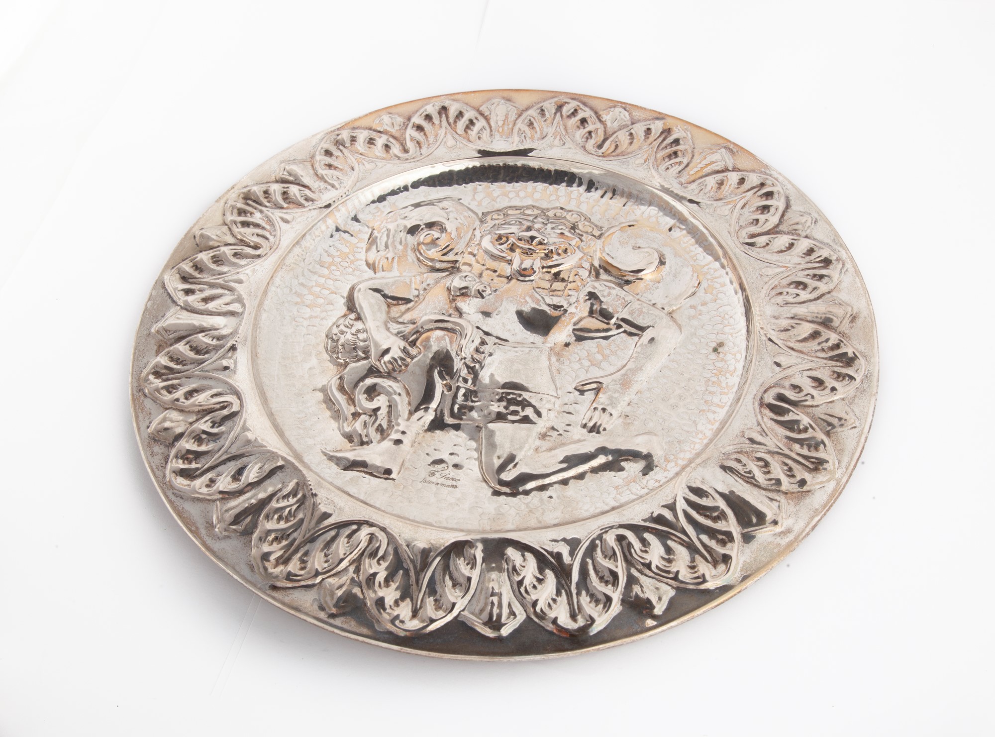Piatto da parata in argento, Gerardo Sacco Roma decorato a sbalzo su fondo martellato da una figura fantastica; lungo la tesa motivi vegetali diametro cm 31 - gr. 578