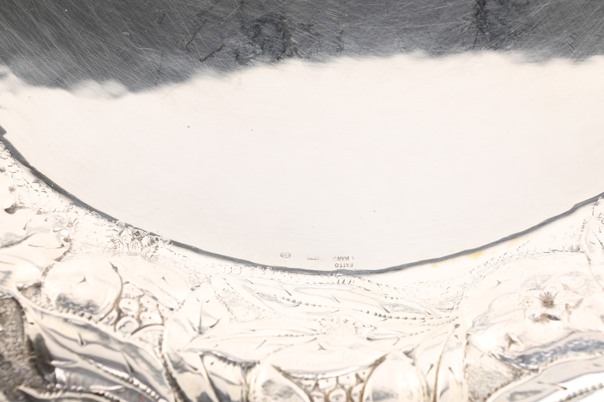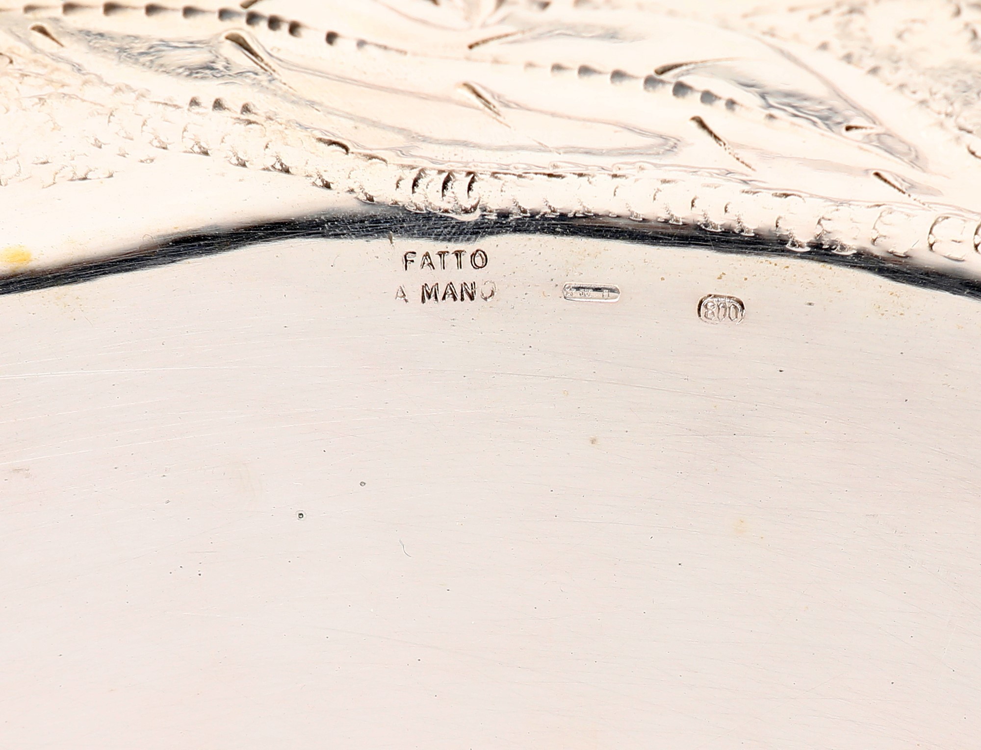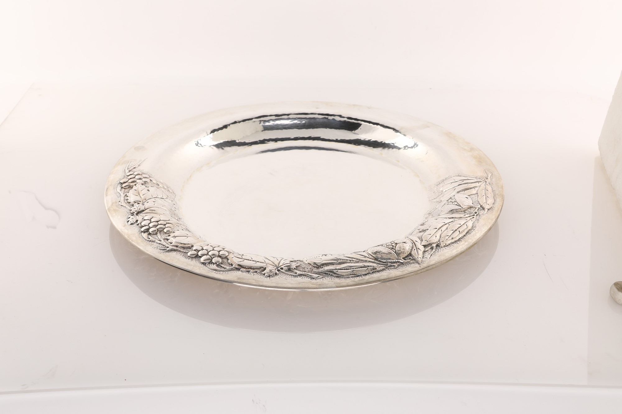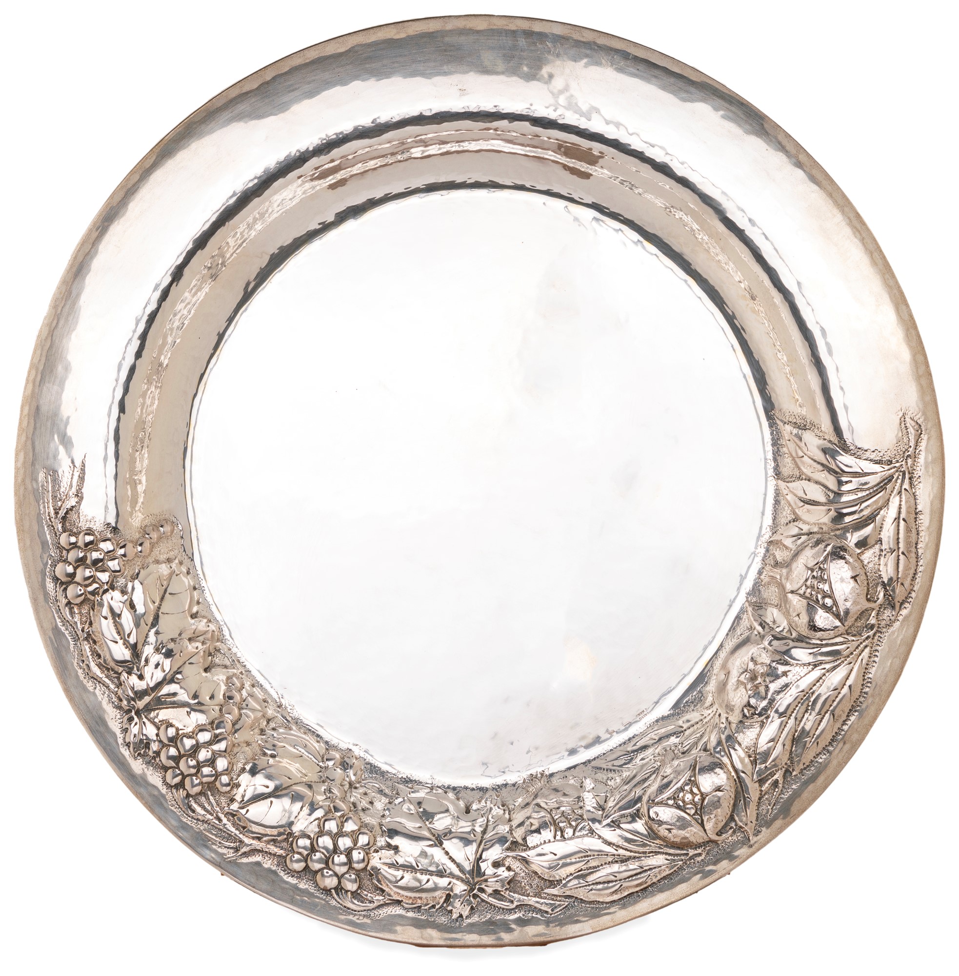Grande piatto in argento 800 lavorato a mano con ampia tesa in parte decorata da tralci d'uva e melagrane sbalzate diametro cm 44,5 - gr. 1632