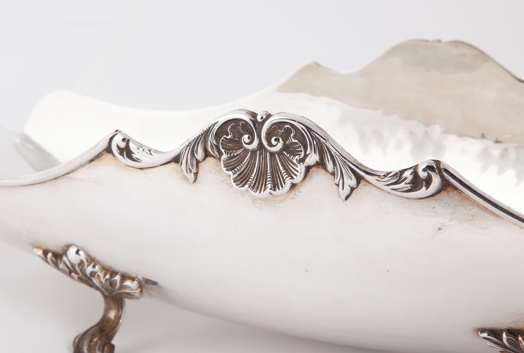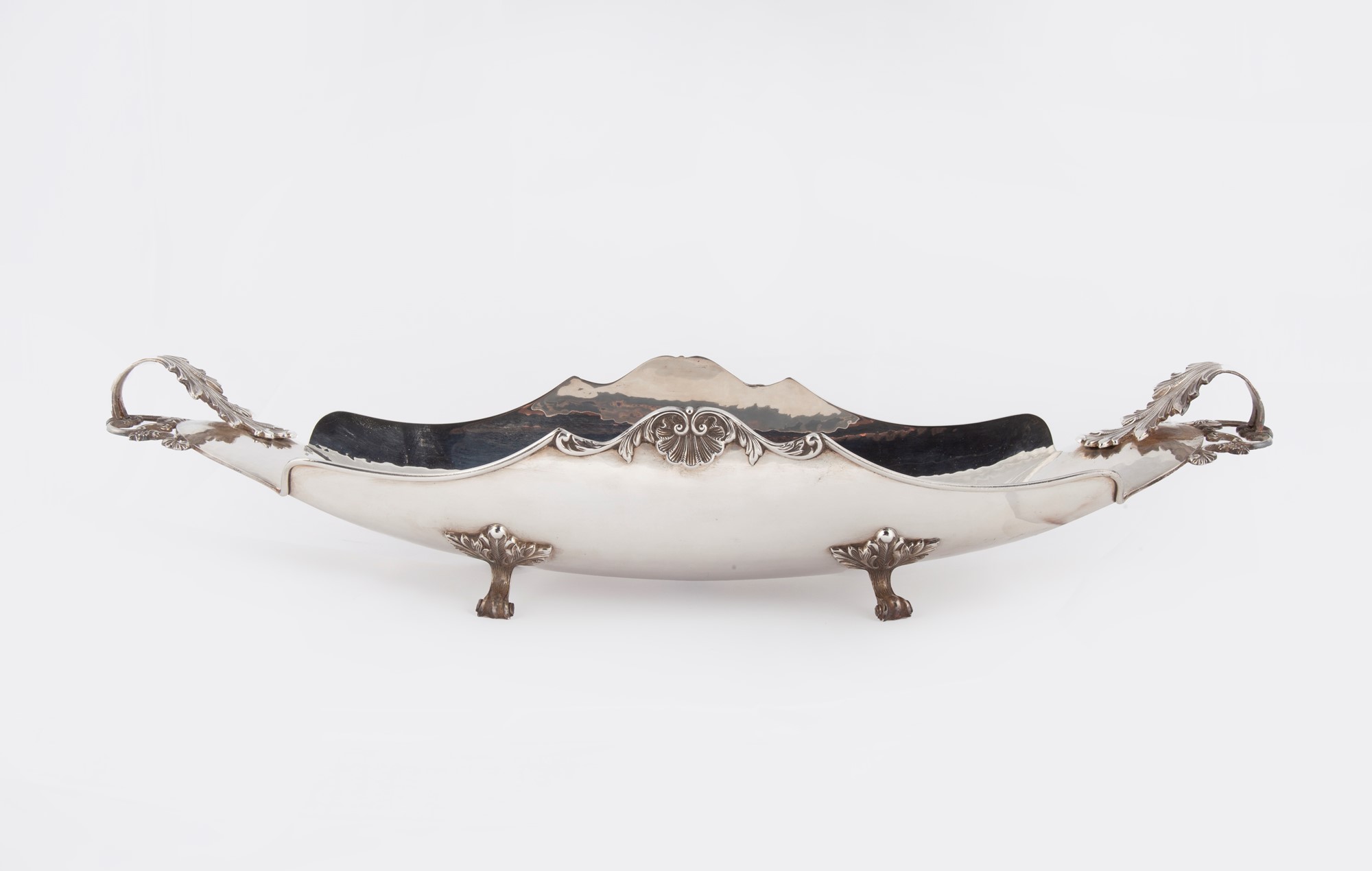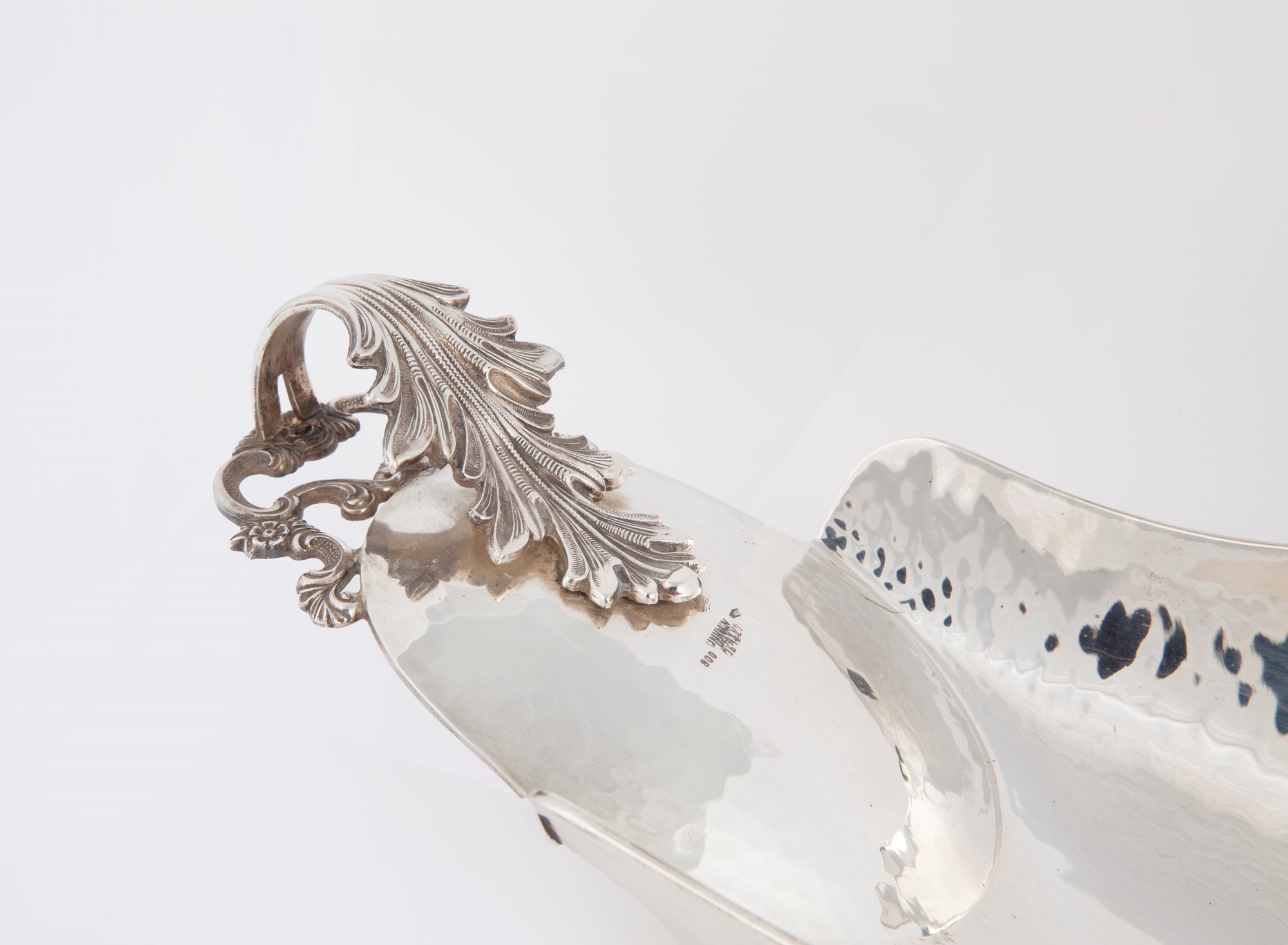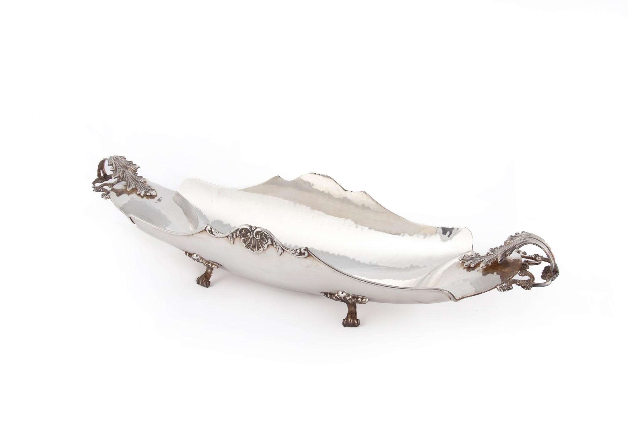 Centrotavola jatte in argento 800 battuto a mano con orlo sagomato abbellito nella parte centrale da conchiglie e vertici arrotondati da cui emergono rilievi vegetali cesellati ed incurvati; piedi con attacco a palmetta cm 9x48x13 - gr. 694