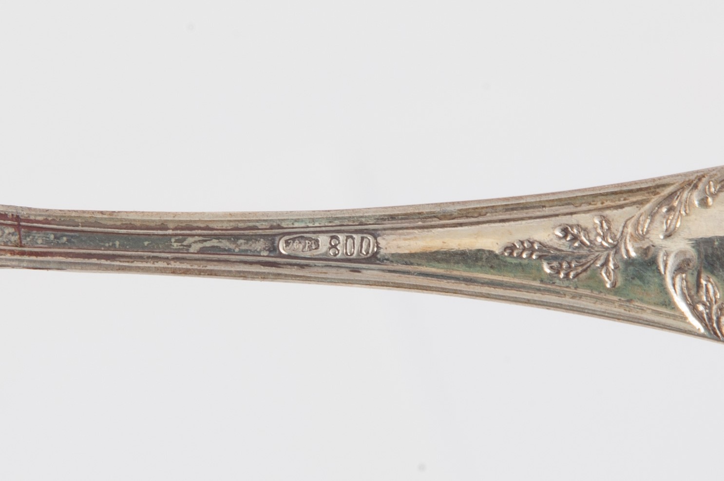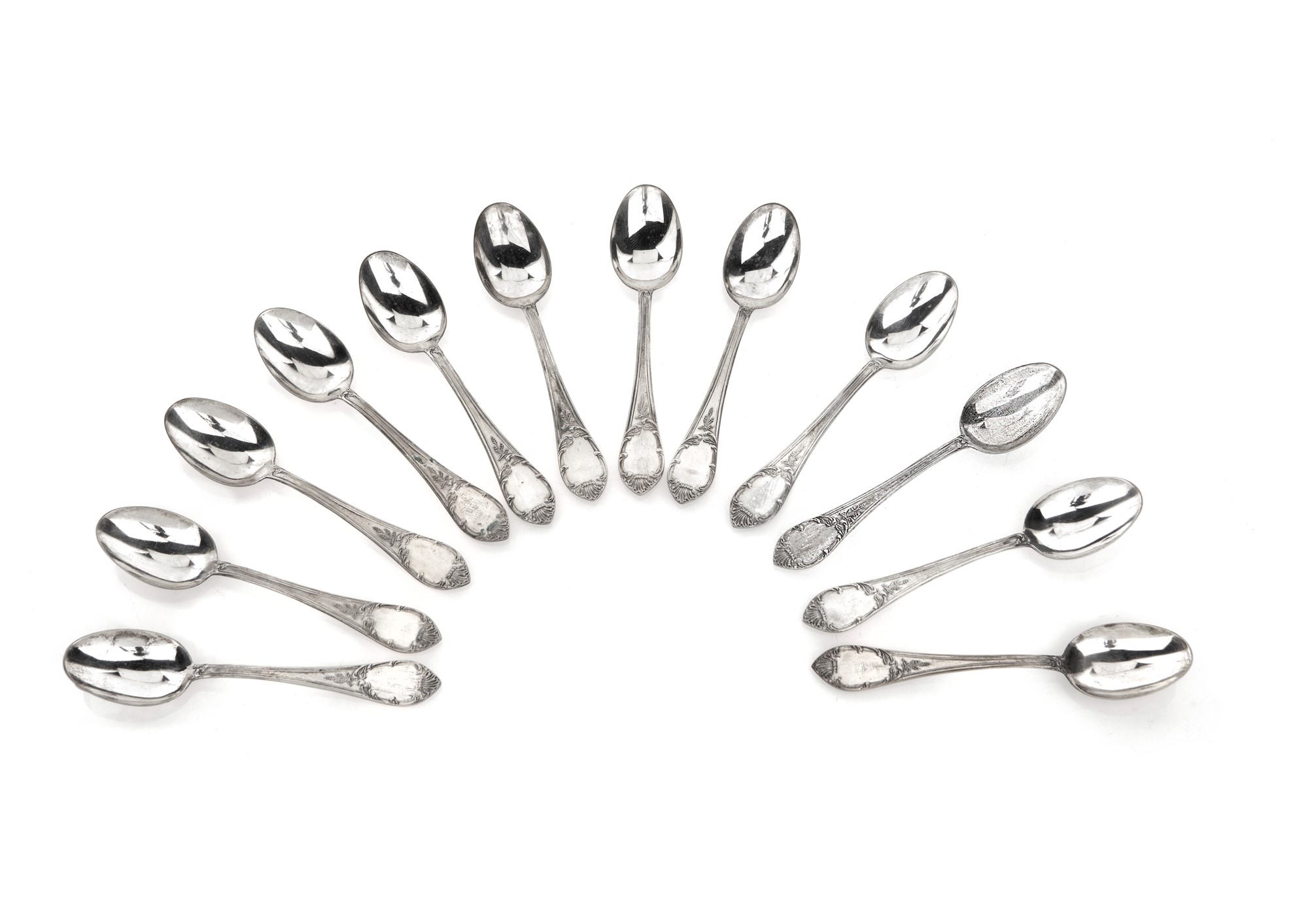 Dodici cucchiaini da caffe in argento 800 con impugnatura dal vertice appuntato, arricchita da rilievi vegetali cm 10 - peso complessivo gr. 106