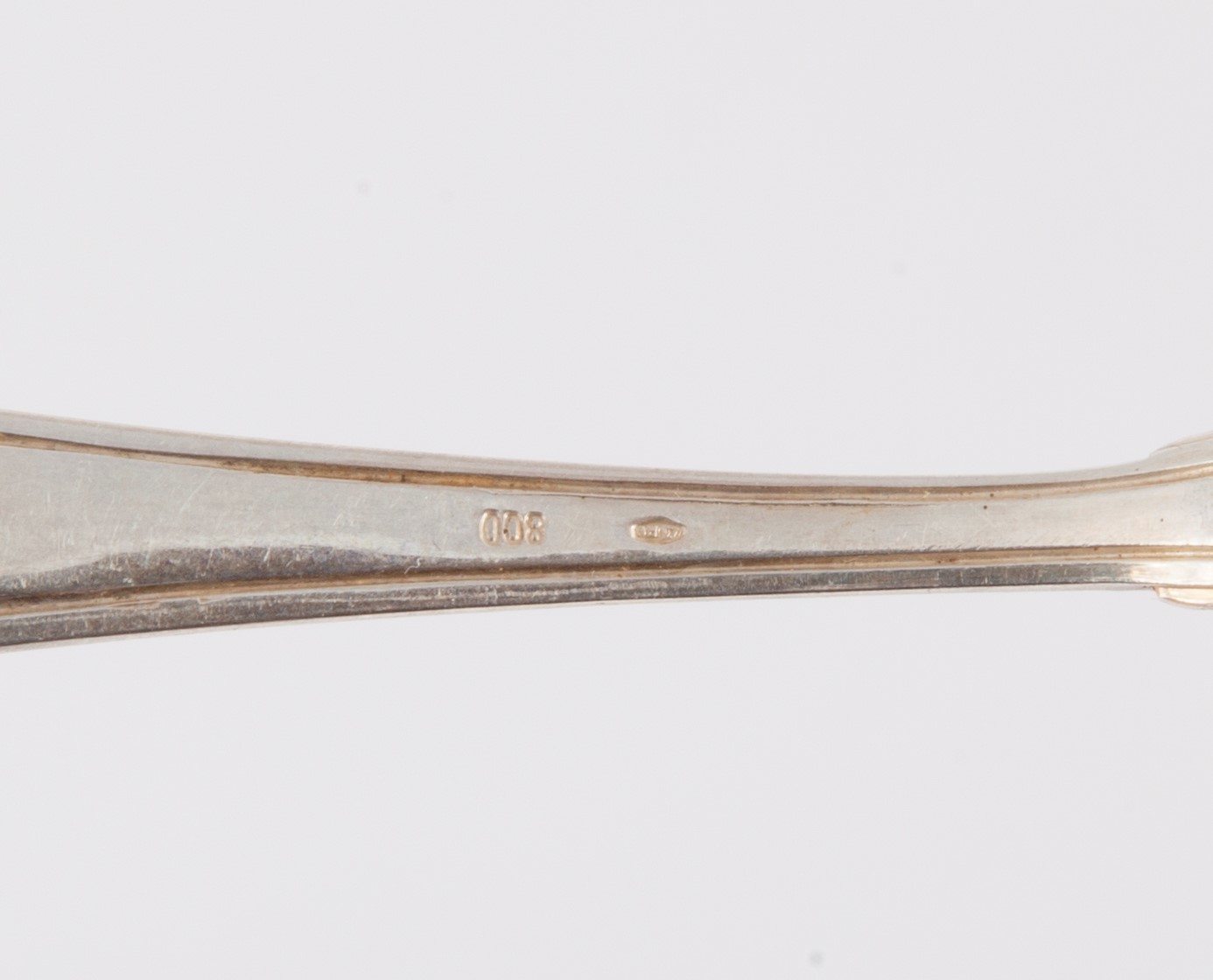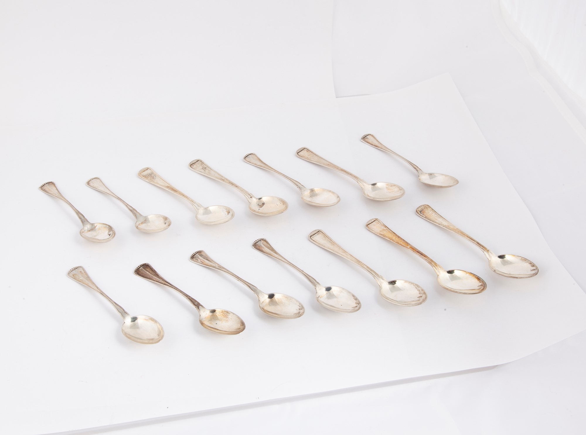 Quattordici cucchiaini da caffè in argento 800/1000 suddivisi in due set dalle analoghe caratteristiche, con vertice dell'impugnatura squadrato con piccoli baccelli cm 10 (8) e cm 10,5 (6) - peso complessivo gr. 142