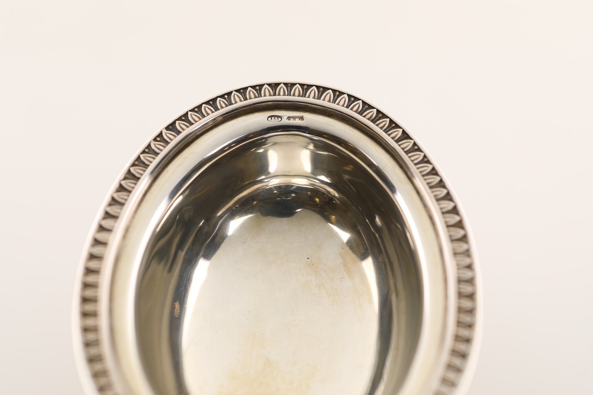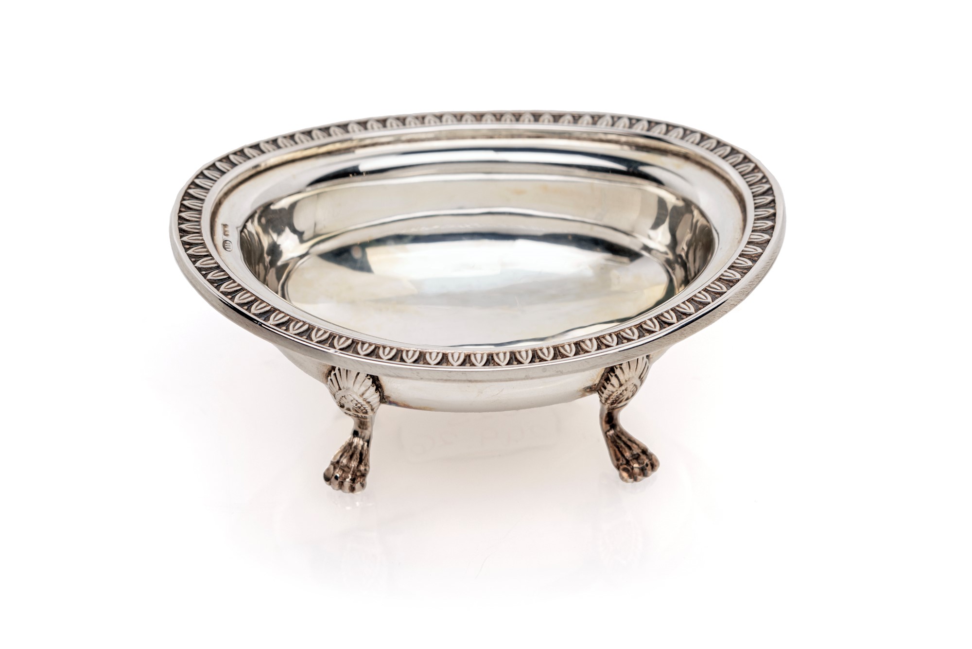 Piccola coppetta ovale in argento con profilo a palmette, elemento distintivo ripreso all'attaccatura delle gambe terminanti a piede ferino cm 4x10x7,5 - gr. 58