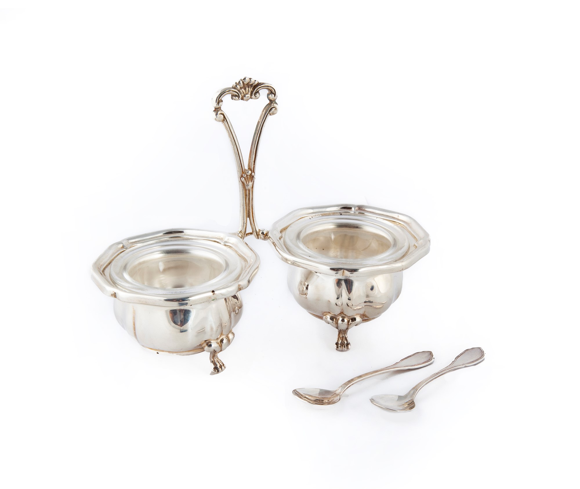 Saliera in argento 925 a doppia vaschetta con cucchiaini presa centrale, piedi ferini. Completa di contenitori in vetro cm 10,5x13,5x6,3 - gr. 118