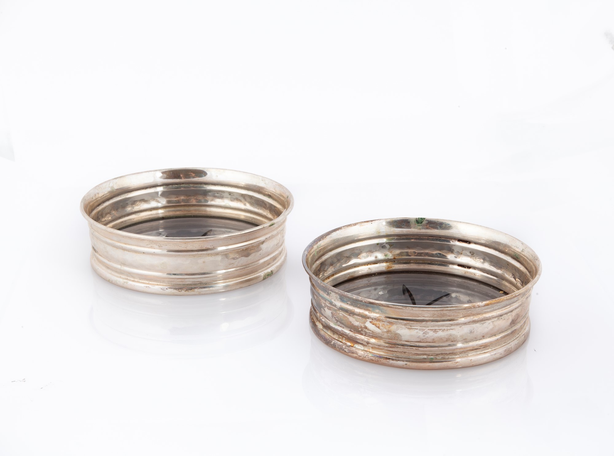 Coppia di sottobottiglia in argento e cristallo bordo martellato e modanato, il piatto centrato da motivo a stella cm 3,5x11