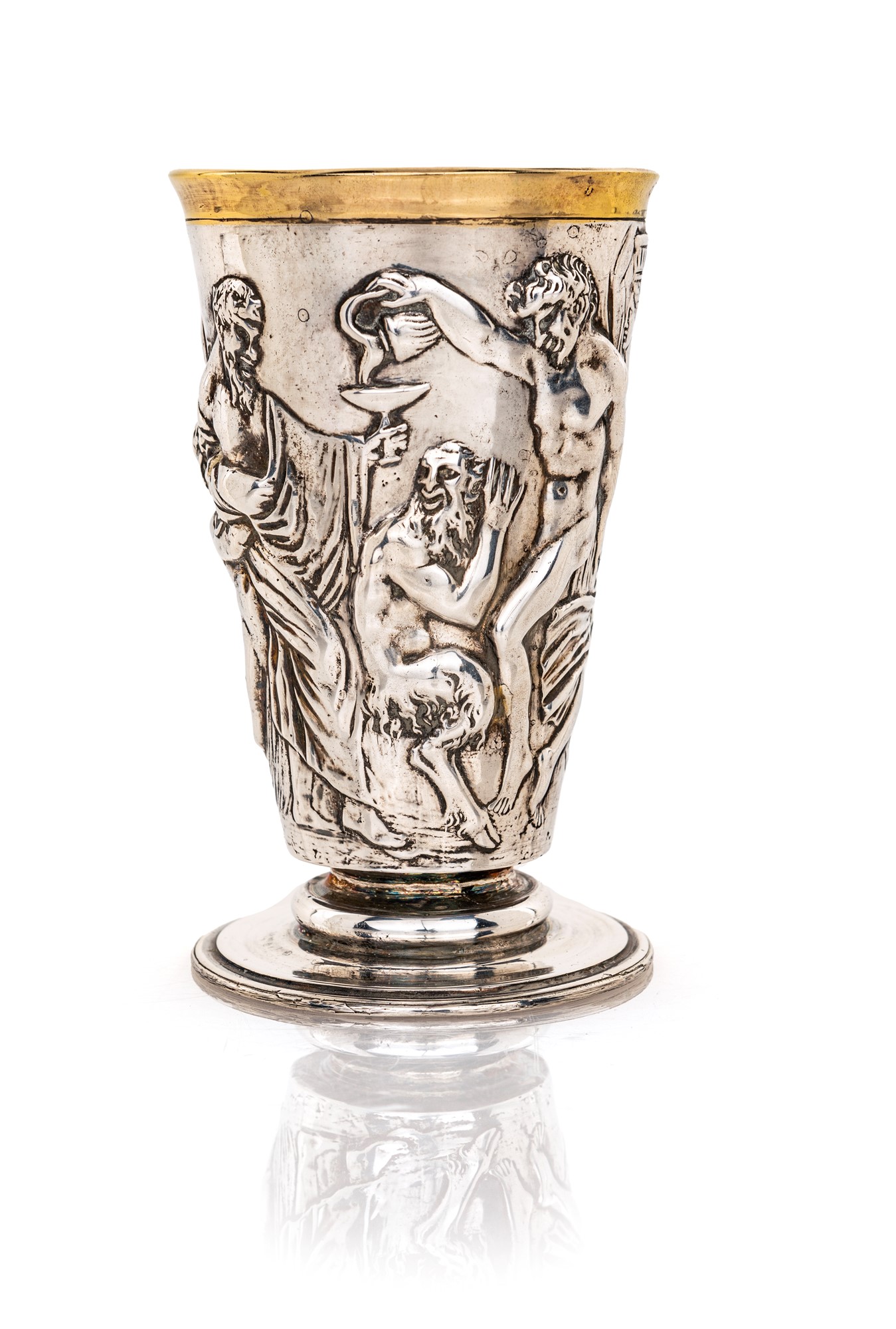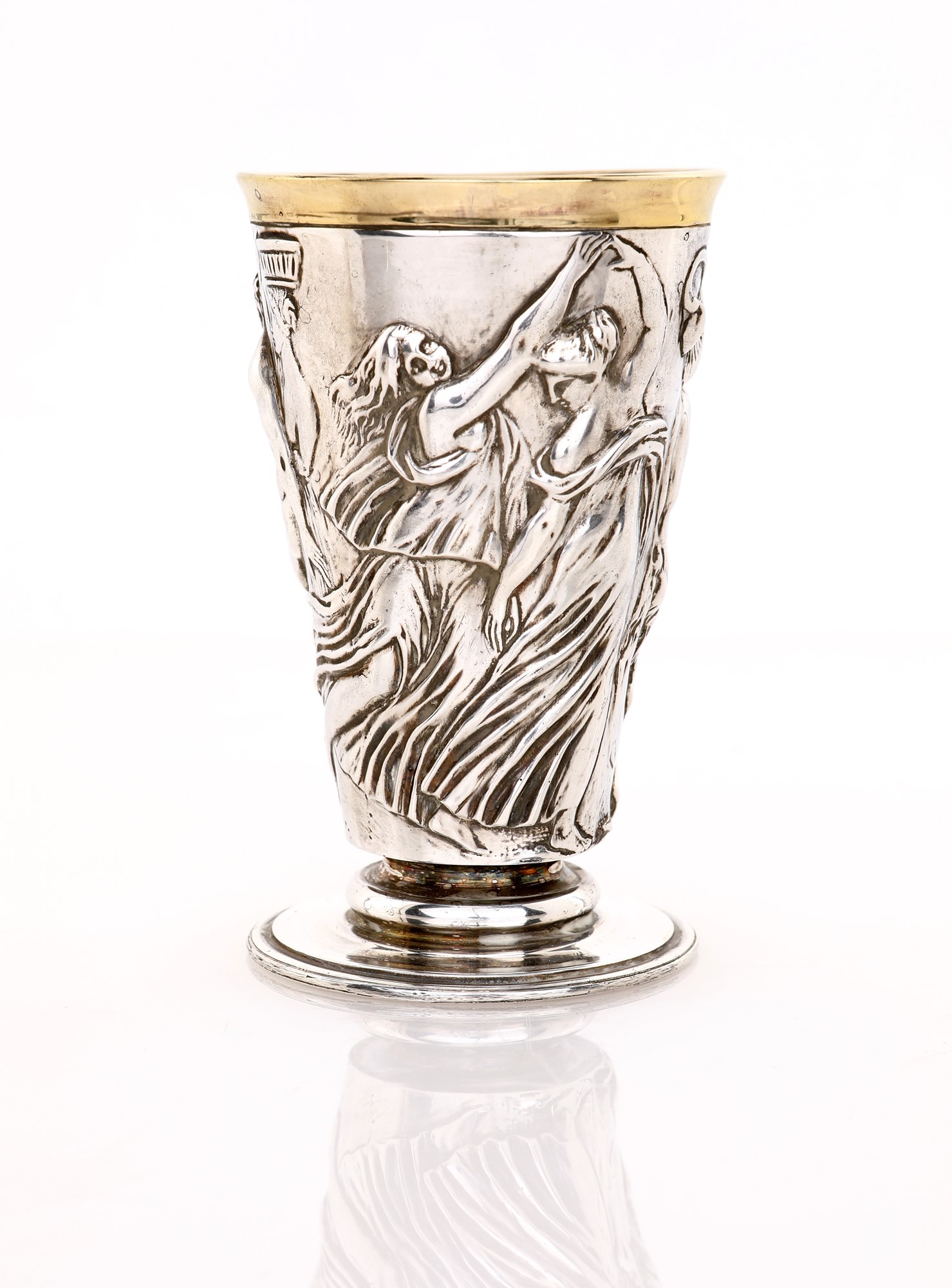 Bicchiere in argento 800/000 di forma conica su plinto e piede circolare, caratterizzato da un corteo bacchico con fauni e menadi danzanti realizzati in bassorilievo altezza cm 13,5 - gr. 778
