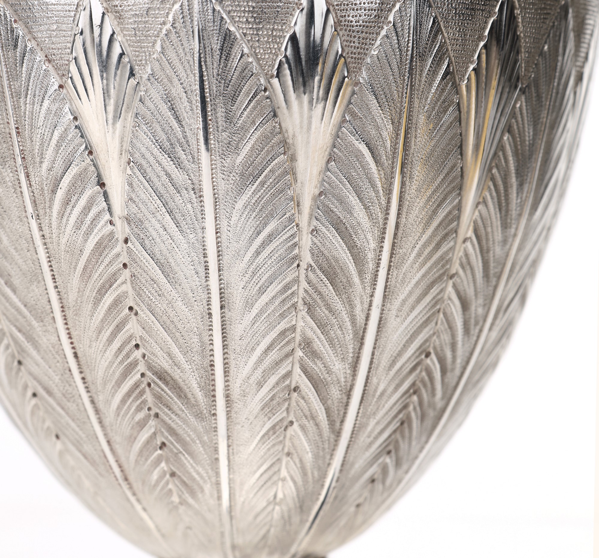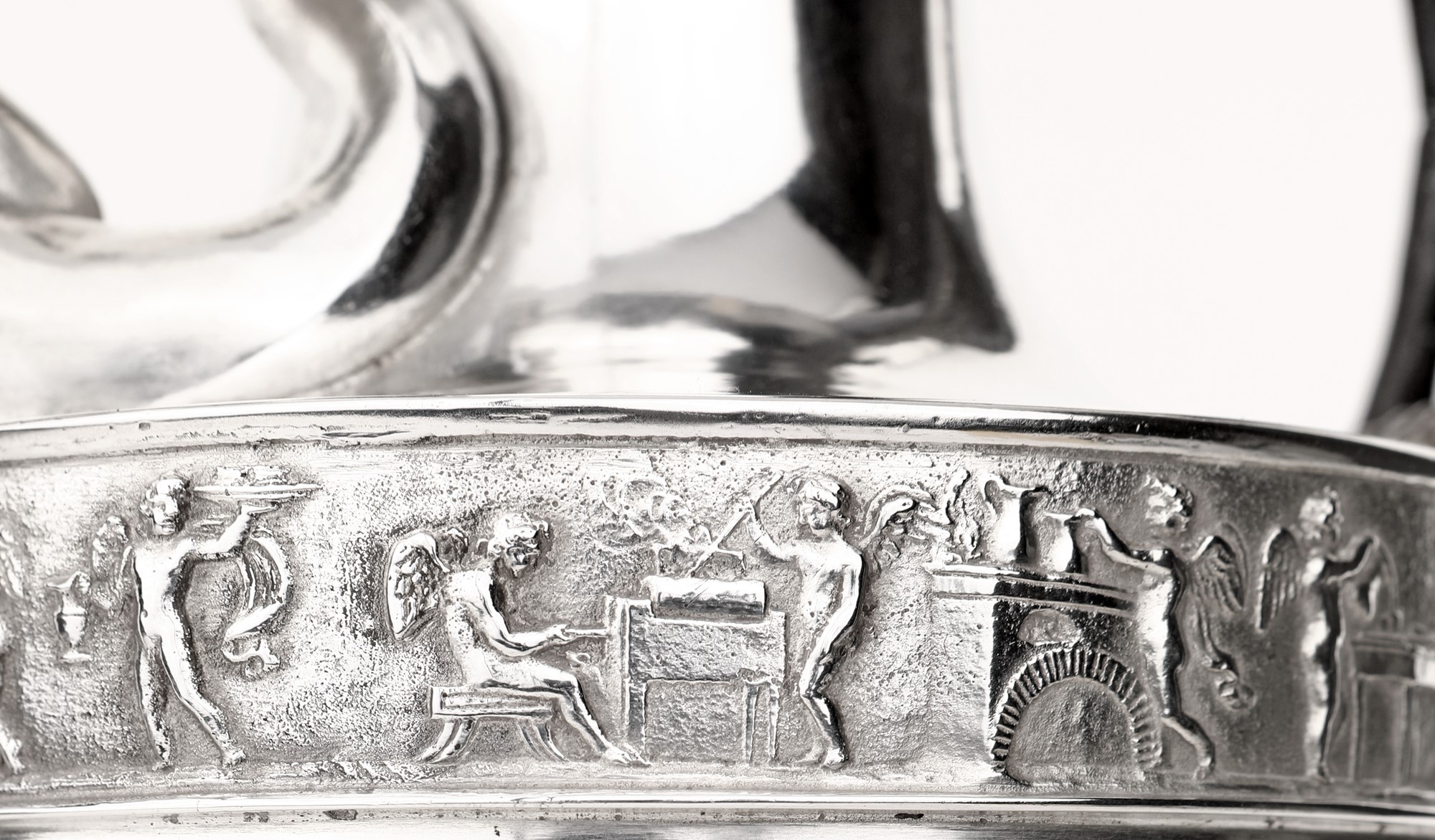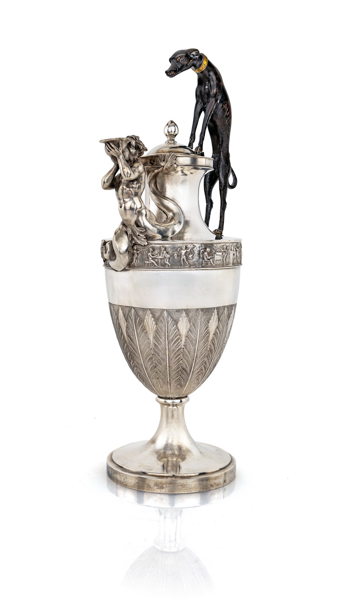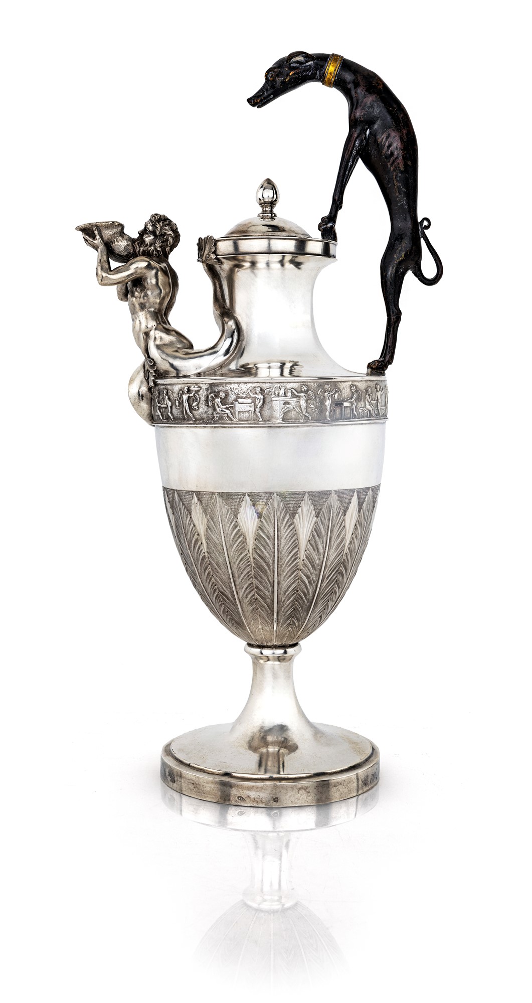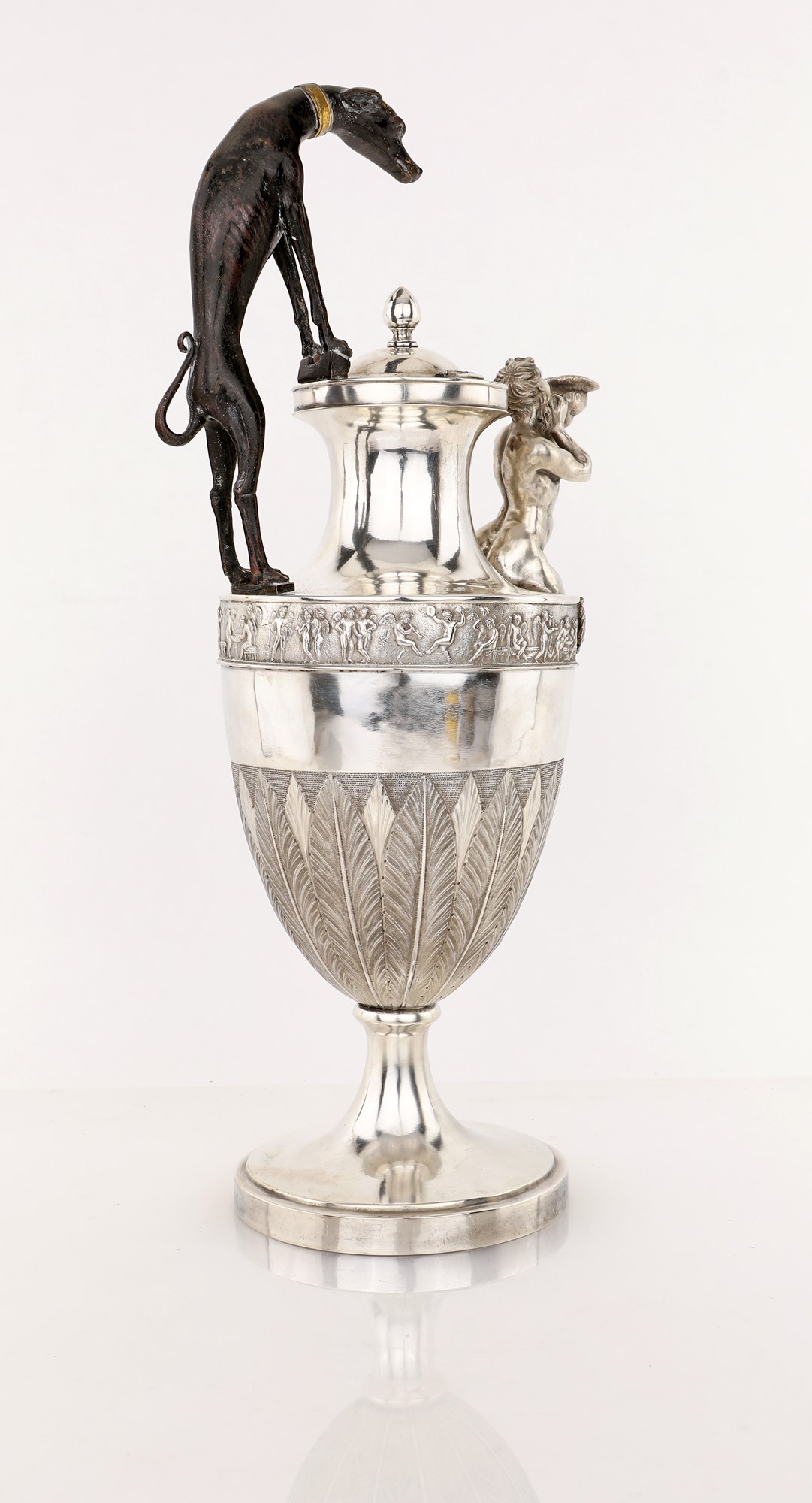 Corpo ad anfora impreziosito nella parte inferiore da lunghe foglie lanceolate minuziosamente cesellate; un corteo di amorini in bassorilievo ritratti in molteplici attitudini si dispone lungo la fascia superiore al limite della spalla, su cui si erge il collo sormontato da coperchio incernierato dominato da una ghianda; alla base del collo si erge la figura del levriero che funge da manico e, diametralmente opposto, siede un tritone dalla lunga barba, le cui code posano sull'orlo e lungo la fascia, ritratto nell'atto di soffiare in una bucina che funge da beccuccio. Piede circolare liscio.