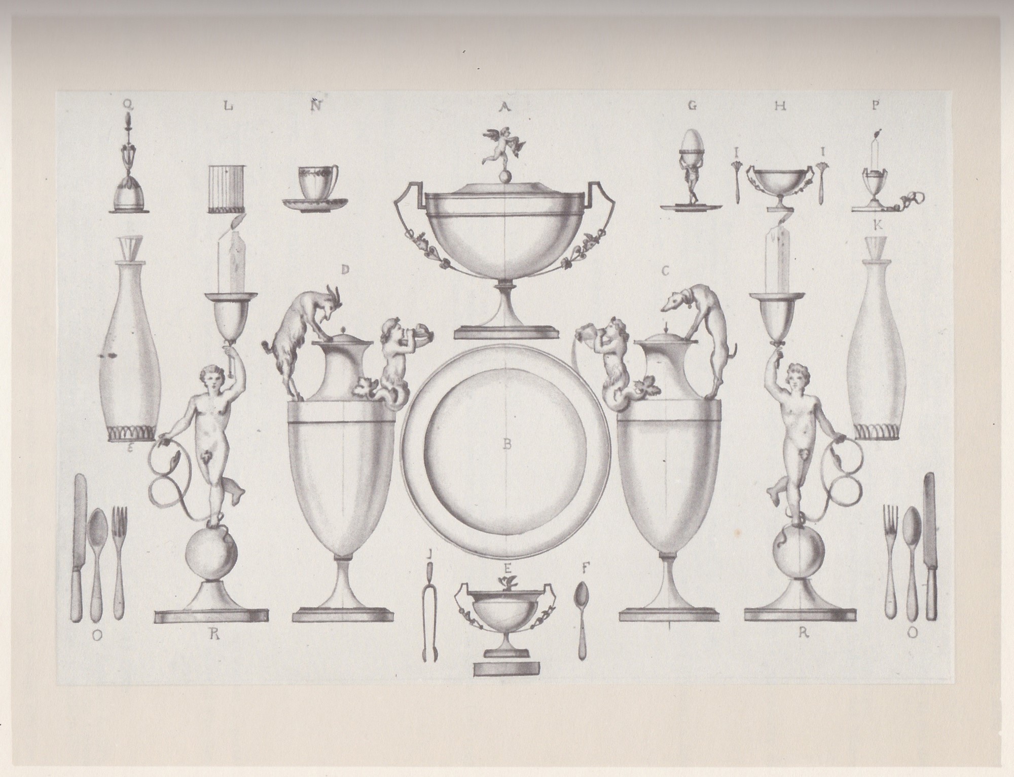 Questo versatoio ricalca molto da vicino il modello documentato di Pietro Belli; se ne discosta unicamente nelle decorazioni (la presenza delle palmette lanceolate sulla parte inferiore della coppa ed il corteo di figure lungo la spalla) ma l’impianto formale resta quello del disegno di Pietro: il levriero, figura elegante molto apprezzata nel Neoclassicismo, simbolo di fedeltà, ed il tritone versatoio.