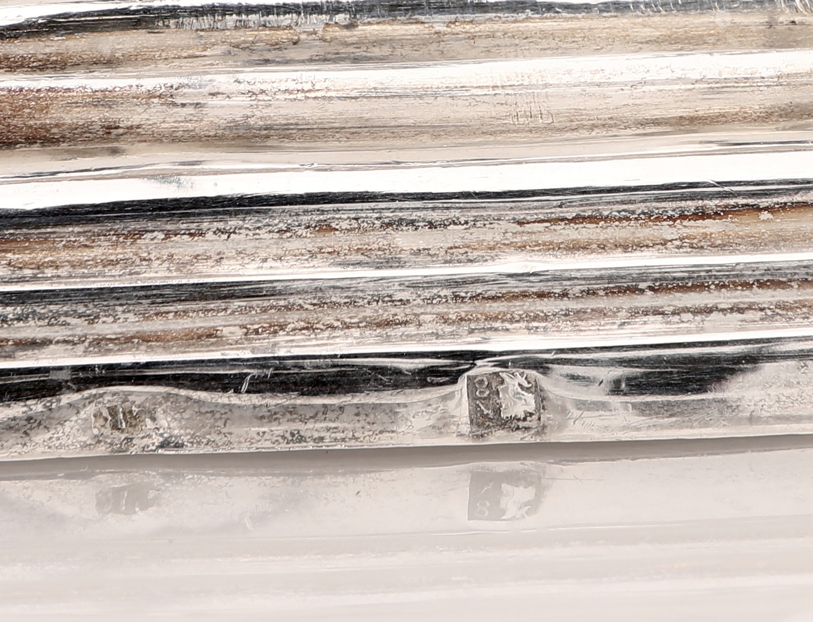 Coppia di saliere in argento 834/1000, Napoli, 1832 - 1872, argentiere L.R. vaschetta rettangolare baccellata con orlo sagomato modanato, dorata internamente e bipartita da un divisorio con presa ad anello; base rettangolare gradinata cm 10,5x9x7 - gr. 264