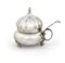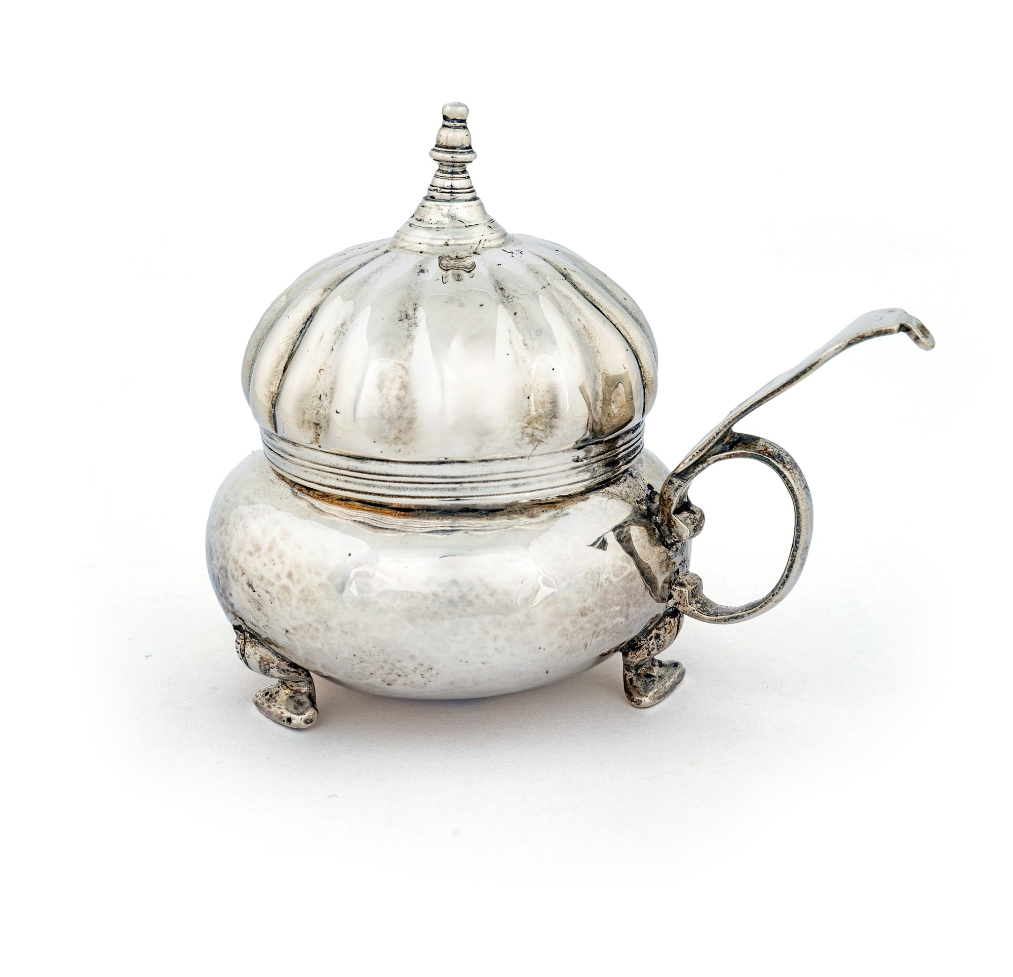 Bugia in argento, Venezia, XVIII secolo corpo sferico schiacciato sorretto da tre piedi a ricciolo, coperchio a cupolino baccellato ed incernierato, sormontato da un pinnacolo; presa laterale ad anello con appoggio. Bollo dell'argentiere consunto e del saggiatore R.P. cm 9x11x7 - gr. 162 Piero Pazzi, "I punzoni dell'argenteria e oreficeria veneta", tomo I, pag. 173, n. 589