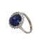 Anello in oro bianco a 'Margherita' uno zaffiro sintetico stellato taglio cabochon al centro e piccoli diamanti taglio 16/16 a contorno.