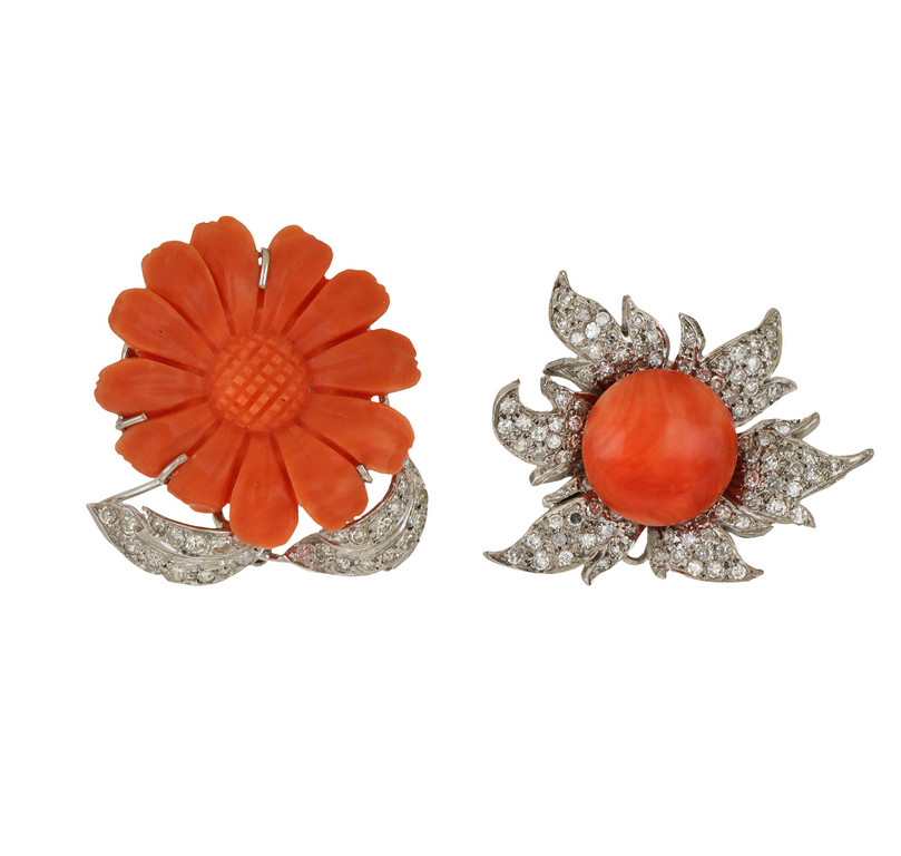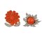 Orecchini fantasia floreale in oro bianco con pavè di diamanti e corallo rosato.