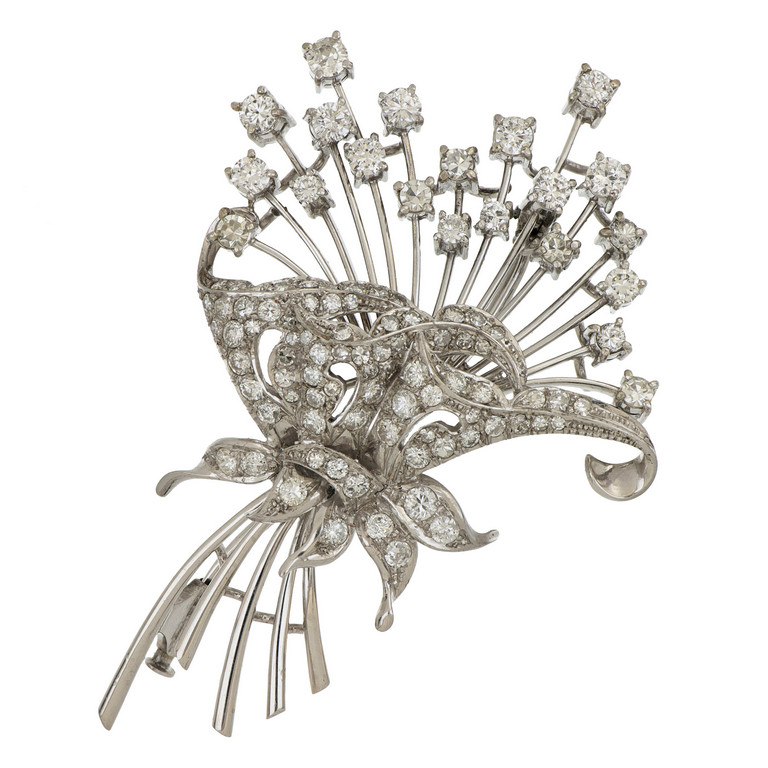 Spilla in oro bianco raffigurante un mazzo di fiori interamente pavettata con diamanti di taglio a brillante e alcuni 8/8.