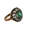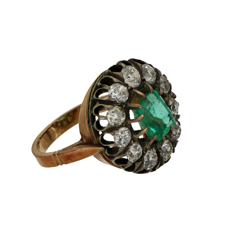 Anello d'epoca con corpo in oro rosso e testa in argento con contorno a margherita e smeraldo colombiano centrale di circa 1 ct e 11 diamanti di taglio antico a formare il contorno.