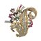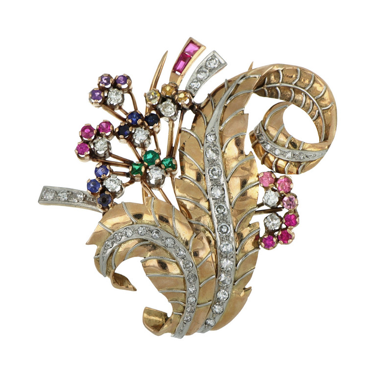 Spilla in oro rosa e platino a motivo floreale il disegno tipicamente anni '40 e' arricchito da diamanti rubini zaffiri e smeraldi.