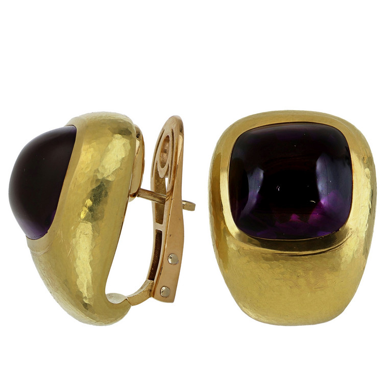 Leo De Vroomen - massicci orecchini in oro giallo con grandi ametiste cabochon fine lavorazione micro martellata. Chiusura a clips con perno passante.