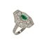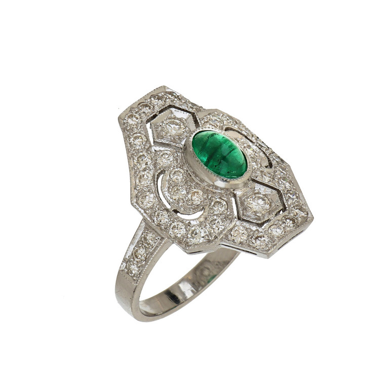Delizioso anello in platino con smeraldo cabochon e diamanti per stimati 0 85 ct complessivi. Lavorato ajour e milligrana.
