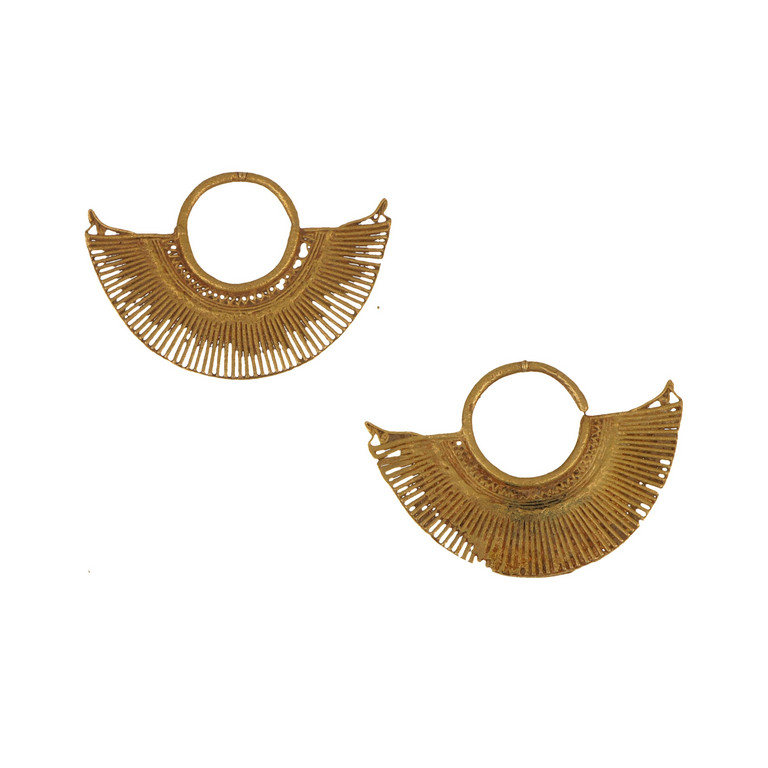 Orecchini ad anella-ventaglio pre colombiani in oro e lega tumbaga lavorazione a millerighe.