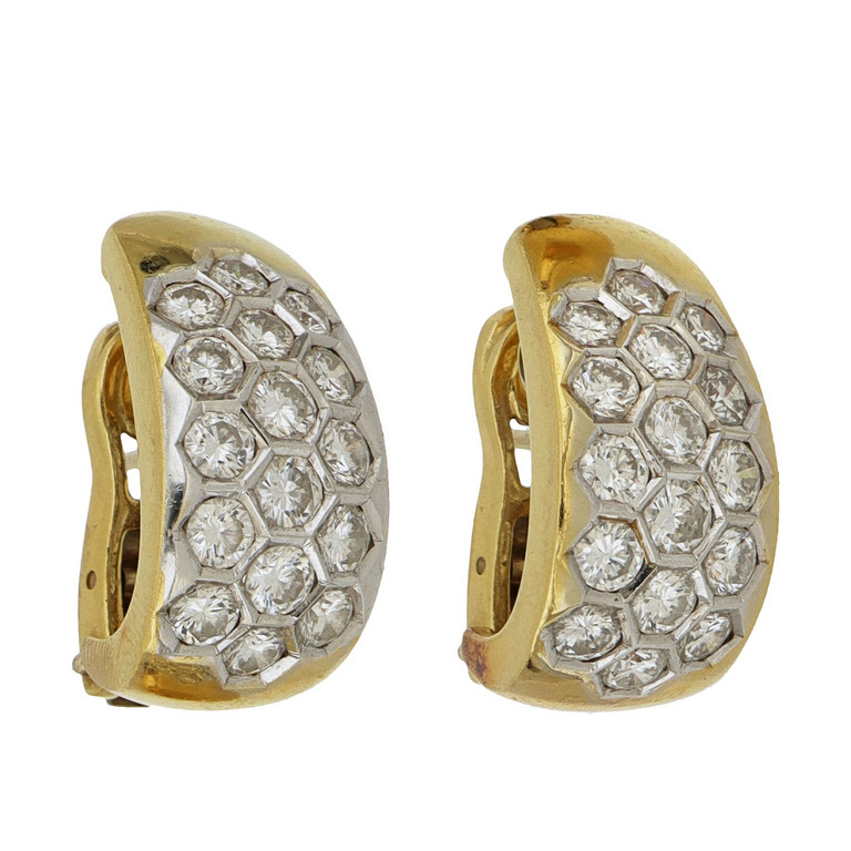 Orecchini in oro giallo e bianco chiusura a clips con perno 32 diamanti taglio brillante sul fronte incassati ad esagoni per stimati complessivi 1 80 ct.