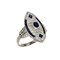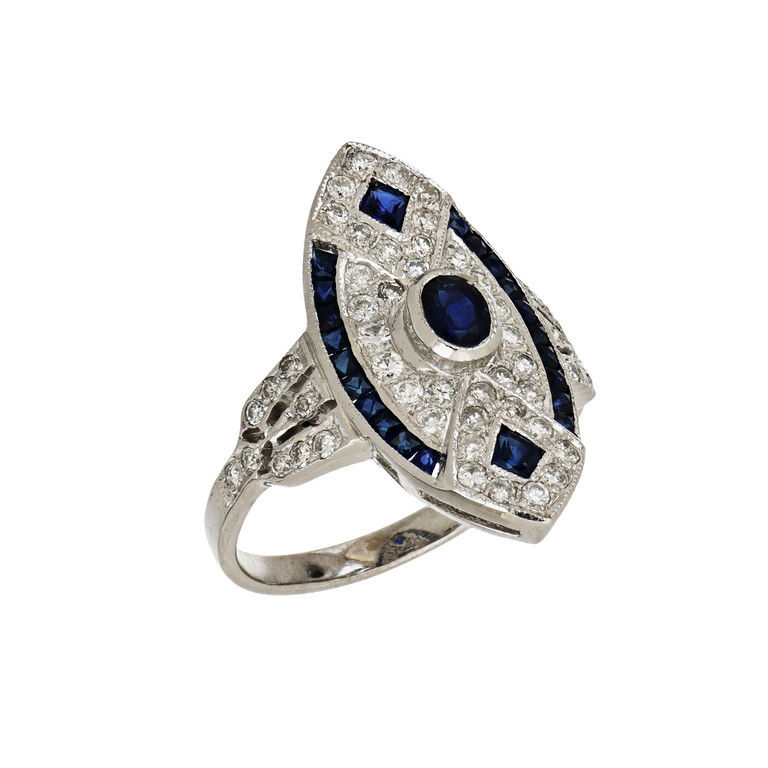 Anello in oro bianco a figaro in stile antico con zaffiri e diamanti a pavè.