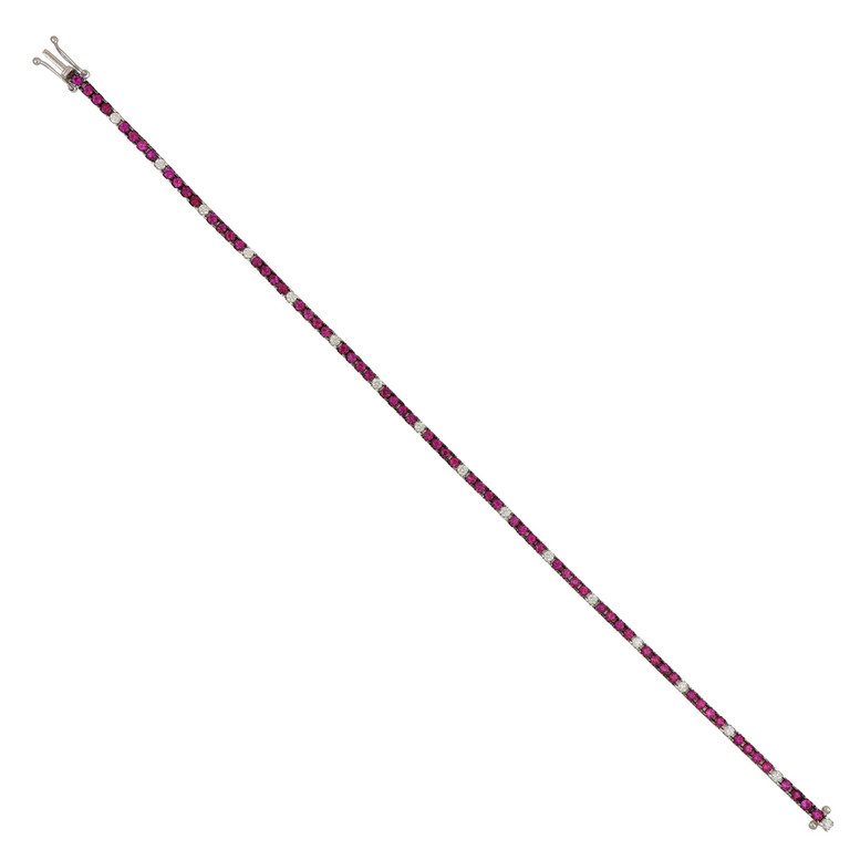 Bracciale tennis in oro bianco con rubini di forma rotonda intervallati ogni 4 da un diamante taglio a brillante.