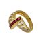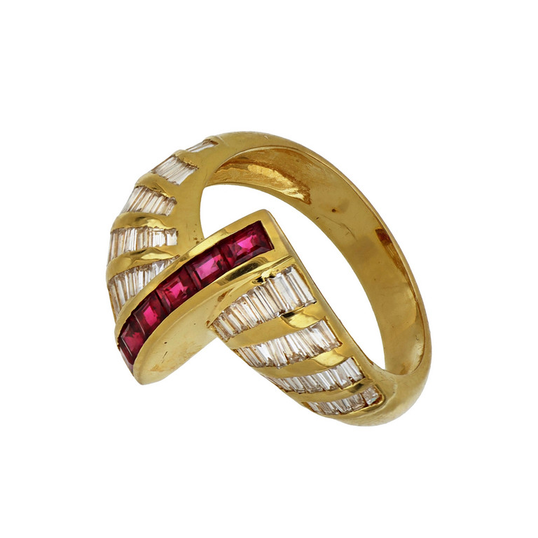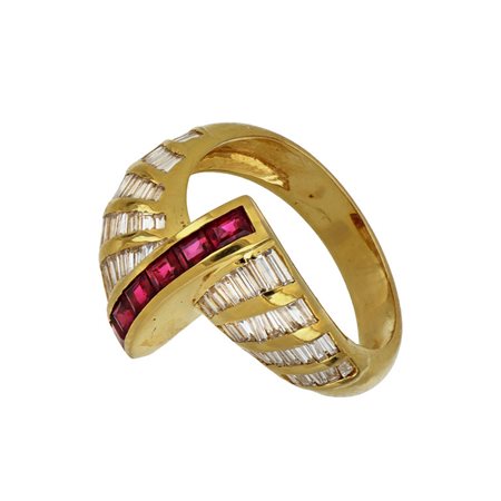 Anello in oro giallo con motivo a contrariè diamanti taglio taper sul gambo per circa 0 85 ct complessivi collegano una costa centrale formata da 6 rubini di forma carrè per 0 60 ct stimati.