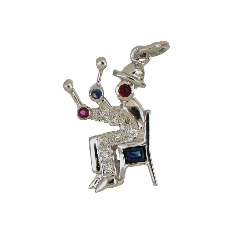 Divertente ciondolo a guisa di pagliaccio giocoliere con zaffiro piccoli rubini e diamanti.