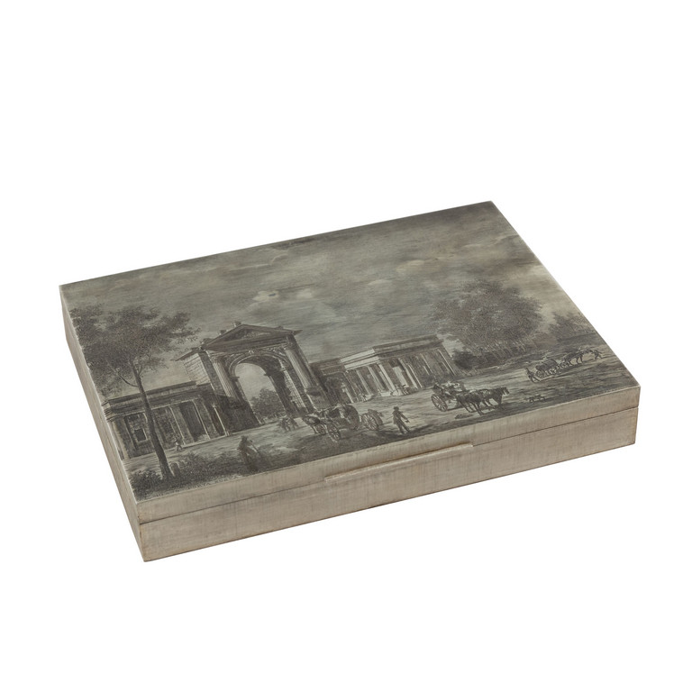 MARIO BUCCELLATI - Grande ed importante scatola in argento completamente incisa sul fronte a bulino raffigurante Milano - Porta Nuova incisione ispirata da una stampa antica. Il resto della scatola è incisa a motivo incrociato e reca sul retro un cartiglio con scritto 'Incisa nella Bottega di Mario Buccellati.