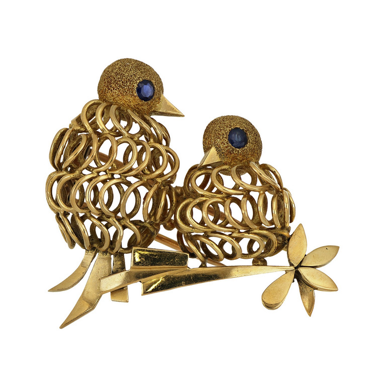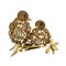 Hermes spilla in oro giallo raffigurante due uccellini accovacciati sul ramo occhi di zaffiro e corpo a gomitolo.