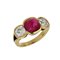Elegante anello tre pietre in oro giallo con rubino centrale di forma quadrata taglio cabochon (sugarloaf basso) il peso è stiamato a circa 3 80 ct dalle misure (8 90 x 8 90 x 4 40 mm.) Le caratteristiche si riferiscono ad una gemma birmana senza trattamenti termici. Completano la montatura due diamanti laterali di forma rotonda di taglio antico di circa 1 ct cad.