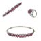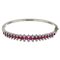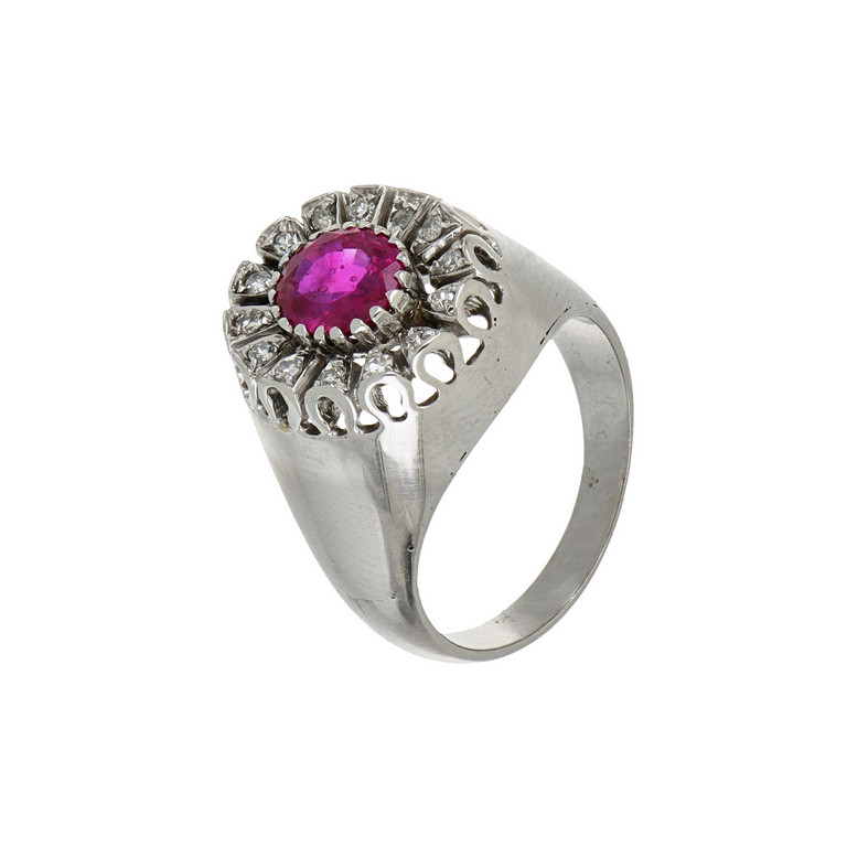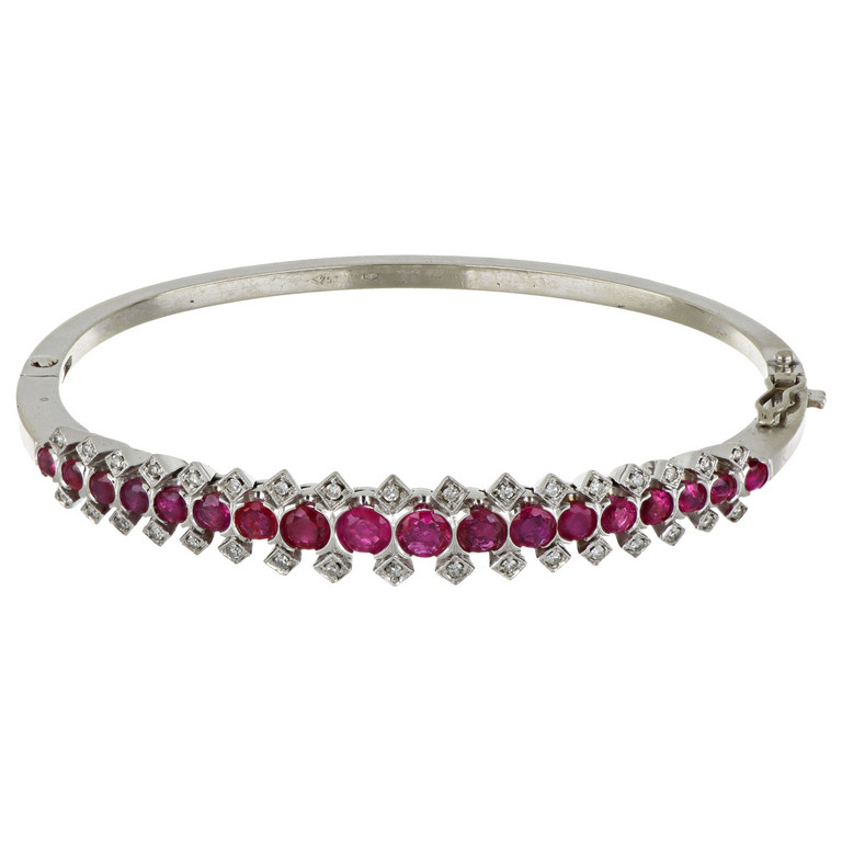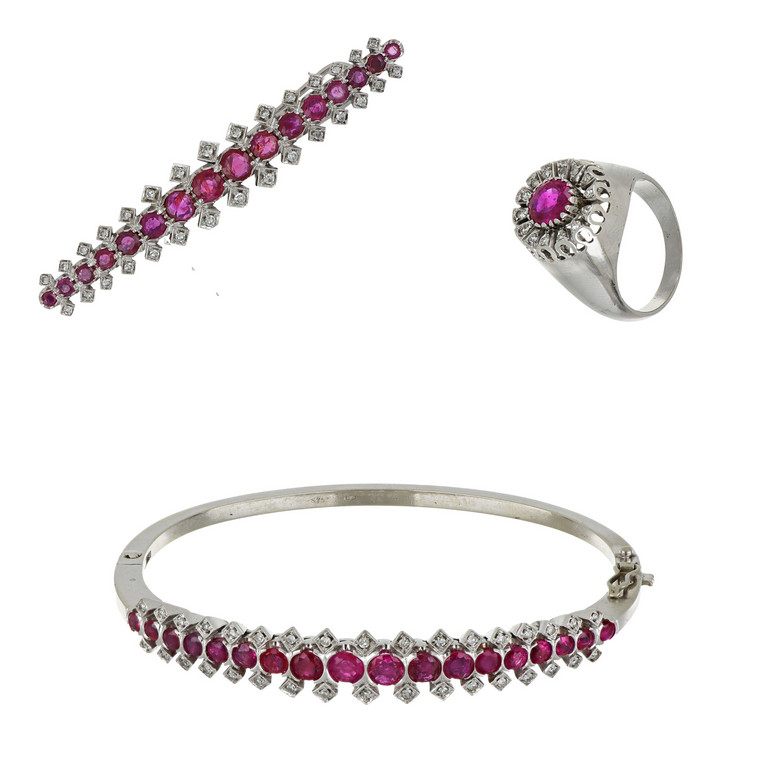 Elegante parure anni 50/60 composta da anello in oro bianco con diamanti e rubino centrale di circa 1 10 ct spilla a barretta in oro bianco con 16 rubini di forma rotonda per stimati 2 ct e bracciale rigido con apertura a cerniera e riviere di 18 rubini per stimati 3 30 ct. diamanti 8/8 per completare la finitura di tutti gli oggetti.