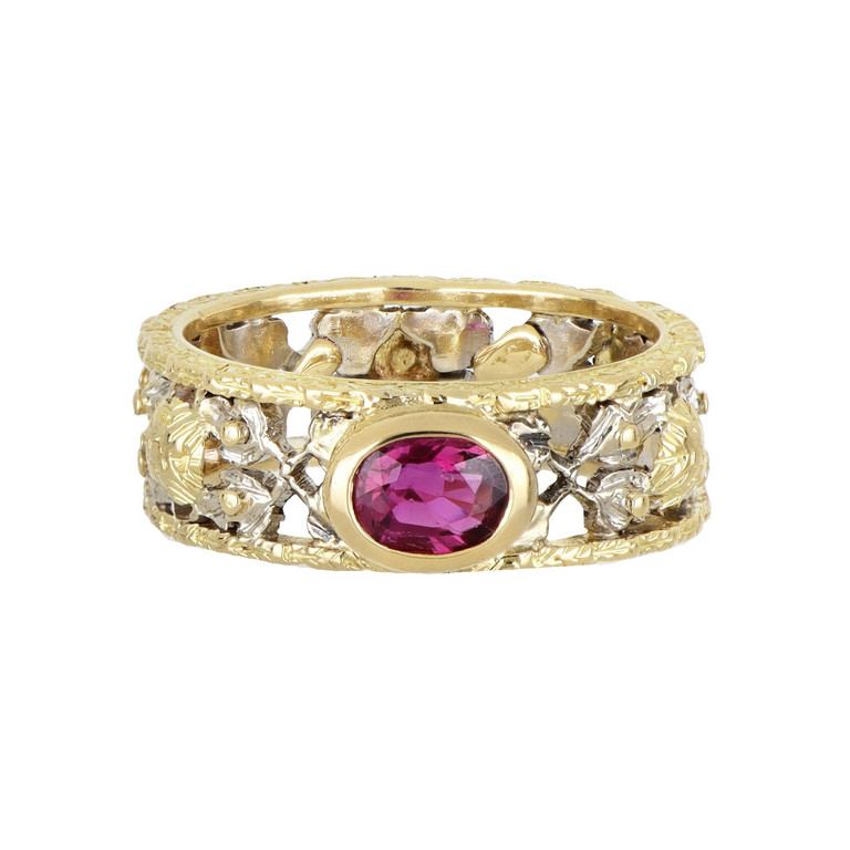 BUCCELLATI - Anello a fascia in oro bianco e giallo con tipica lavorazione della Maison rubino ovale di circa 0 80 ct stimati punzone 15MI e firma estesa M.Buccellati sul gambo.