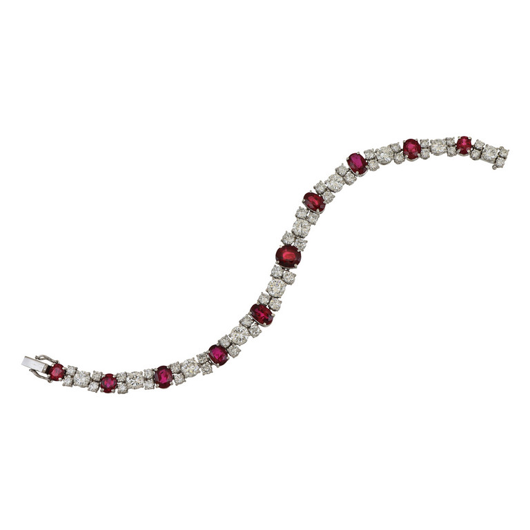 Elegante ed importante bracciale in oro bianco con 50 diamanti di forma rotonda taglio a brillante per un totale di 8 20 ct e 10 rubini di ottimo colore di forma ovale taglio misto per una caratura stimata di 8 ct circa.