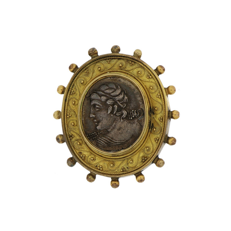 CASTELLANI (Attr.) Antica spilla revival archeologico in oro con la tipica lavorazione a granulazione. La moneta è un denario reppublicano della Zecca di Roma coniata sotto il console Marco Licinio Crasso nell'84 a.c. Sul fronte busto di Apollo visto di spalle con testa volta a sinistra e con la spalla coperta da exomis tiene il fulmine con la mano destra. Sul retro Minerva su quadriga verso destra tiene lo scudo e le redini con la mano sinistra la lancia con la destra.