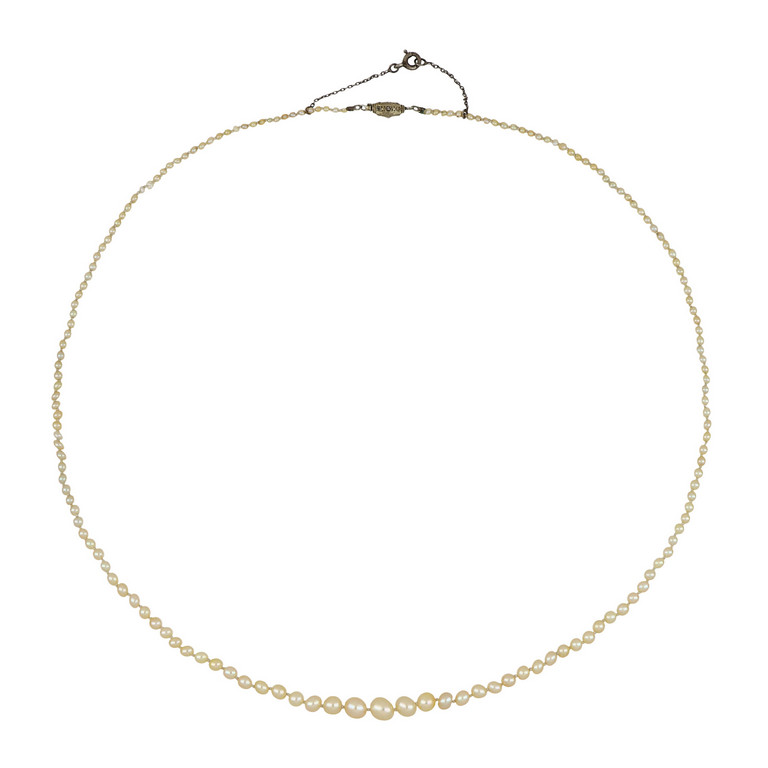 Fine collana in perle naturali di acqua salata scalare da 1 8 a 5 2 mm. chiusura a barilotto in platino inciso e micro icassata con diamanti taglio rosa. Accompagnata da report gemmologico LFG di Parigi attesantante l'origine naturale.