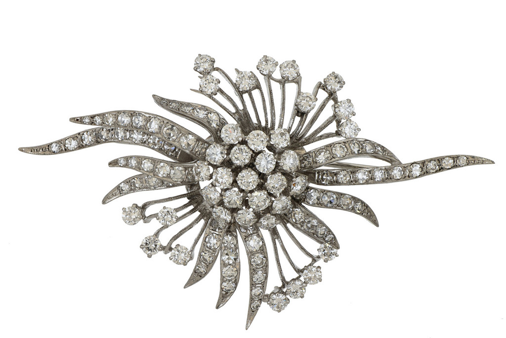 Spilla in oro bianco con centro en tremblant con diamanti naturali di taglio a brillante e 8/8 per 5 5 ct stimati di caratura complessiva.
