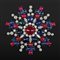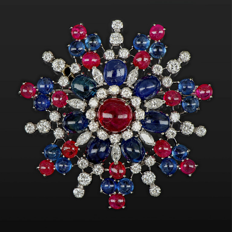Grande spilla a 'fiocco di neve' piramidale con rubini e zaffiri cabochon e diamanti di forma rotonda e navette.