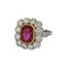 Elegante anello d'epoca con rubino birmano centrale non riscaldato di circa 4 ct stimati (10 25 x 7 53 x 5 52 mm) il contorno è formato da 12 diamanti taglio a brillante e due navette sul gambo per un totale di circa 3 ct complessivi.