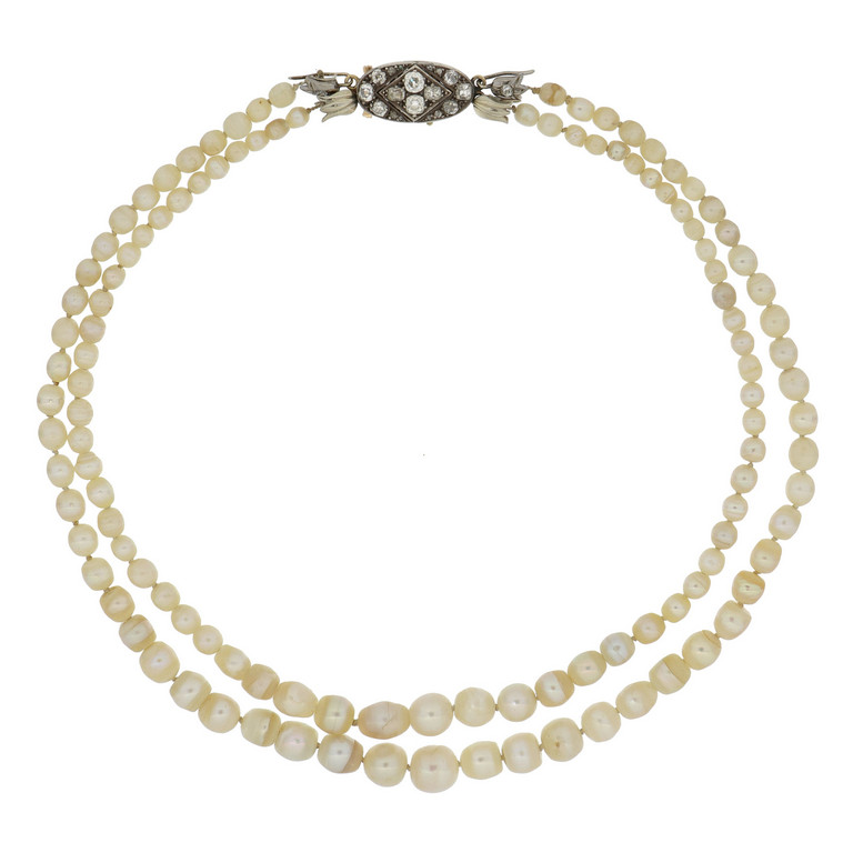 Elegante girocollo a doppio filo di perle. La centrale misura 9 50 x 9 00 mm a scalare fino a 3 50 x 3 00 mm.