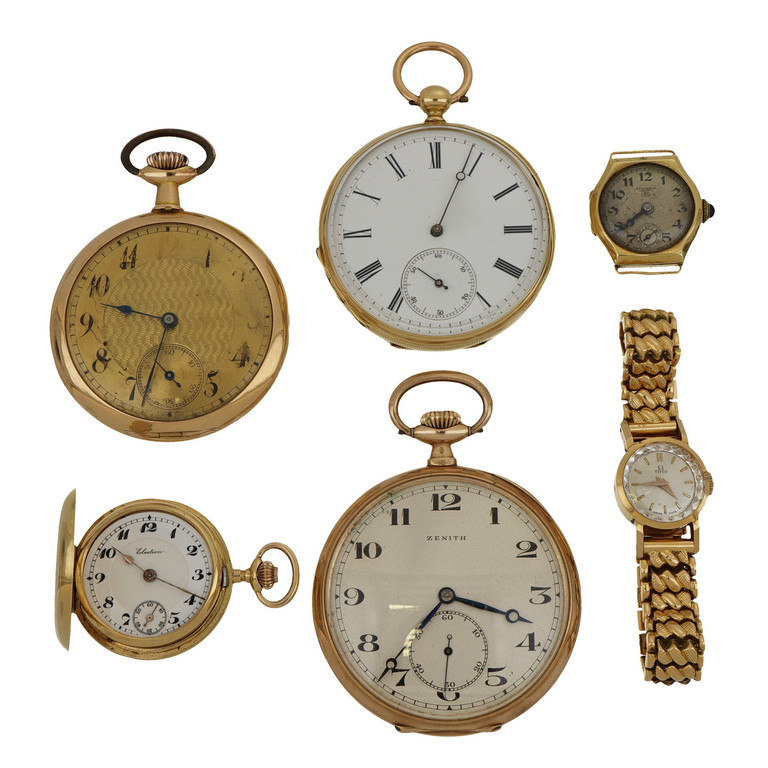 Lotto di orologi in oro a peso composto da quattro orologi da tasca di cui uno di marca Zenith una cassa da polso lady e un orologio da donna braccialato a maglie.