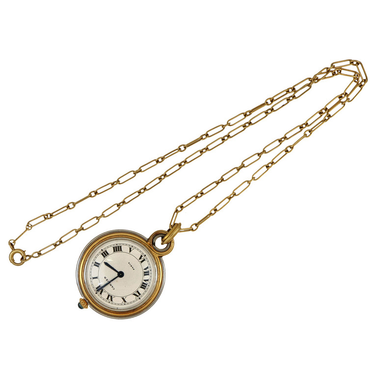Cartier elegante orologio da taschino in oro giallo e acciaio movimento meccanico a carica manuale classico quadrante della maison con numeri romani trattenuto da catena in oro giallo a maglie allungate.